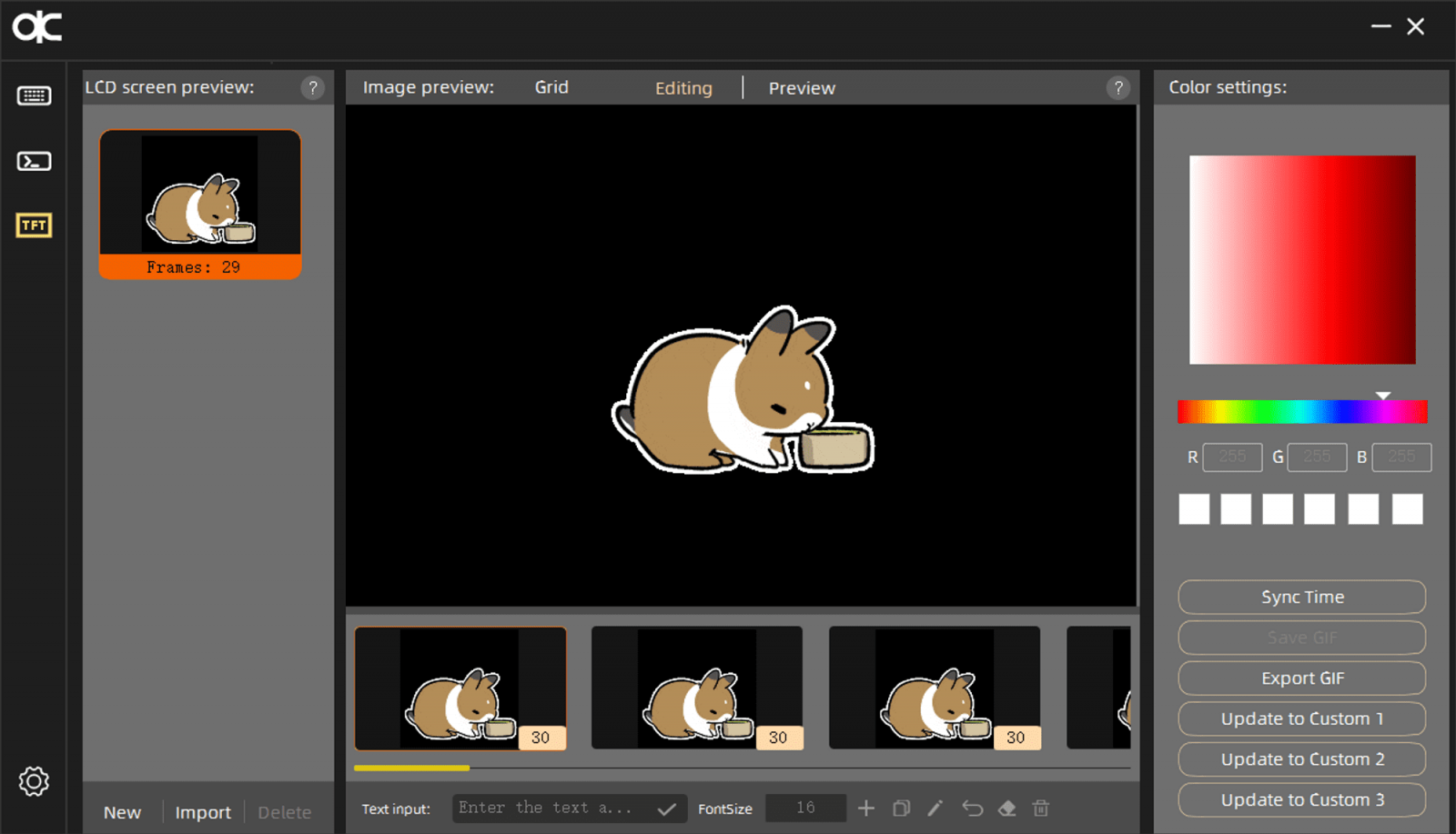 若您需要匯入並上傳GIF動圖檔,請點擊左下角 Import,並利用右側下方update傳入三組記憶位置Custom 1 / 2 / 3 (請注意上傳後會覆蓋原有位置的圖檔!!)