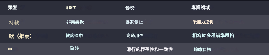 請依照您喜好的硬度,以及擅長的瞄準風格來選擇軟硬度。