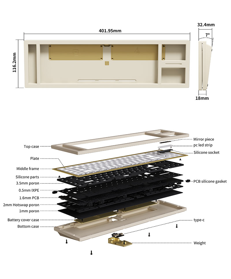 | 包裝內容物: | 上蓋 下蓋 中框 配重 正面勻光塊 燈條飾板 PCB 子板*2 PC定位板(Gasket結構用) 靜音棉組 配件包 說明書 |