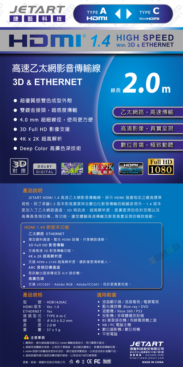 【商品介紹】 JETART HDMI 1.4高速乙太網影音傳輸線,採用HDMI協會制定之最高標準規格,除了承襲1.3版本對高畫質與全數位化影音傳輸的細膩表現外,1.4版本更加入了乙太網路通道、3D視訊流、超高解析度,更廣更深的色彩空間以及高傳真音頻回傳….等功能,讓您體驗高速傳輸及影音真實呈現的極致感動。 【商品特色】 1、超優質感雙色成型外殼
