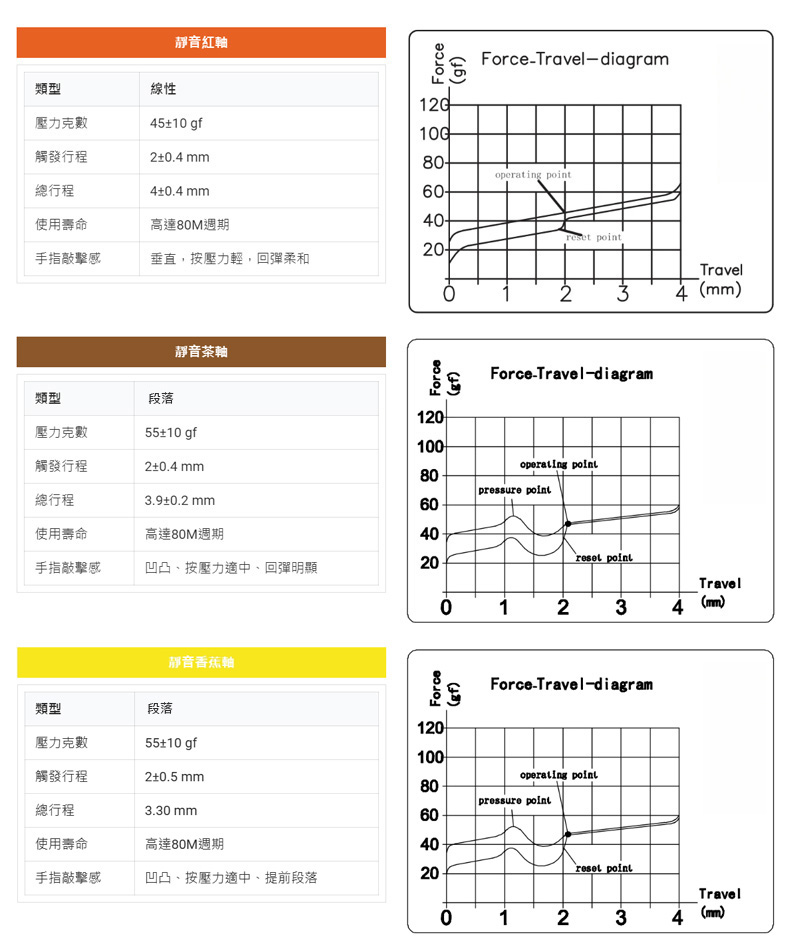 | 鍵程: | 靜音紅軸:4±0.4 mm 靜音茶軸:3.9±0.2 mm 靜音香蕉軸:3.30 mm |