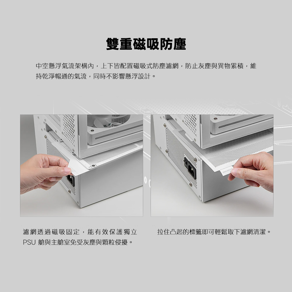 9、3 合 1 前面板模組結合防塵濾網、雙 160mm ARGB PWM 風扇與網孔面板,預先組裝,方便安裝與維護