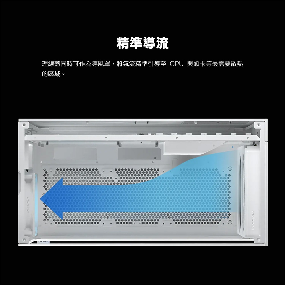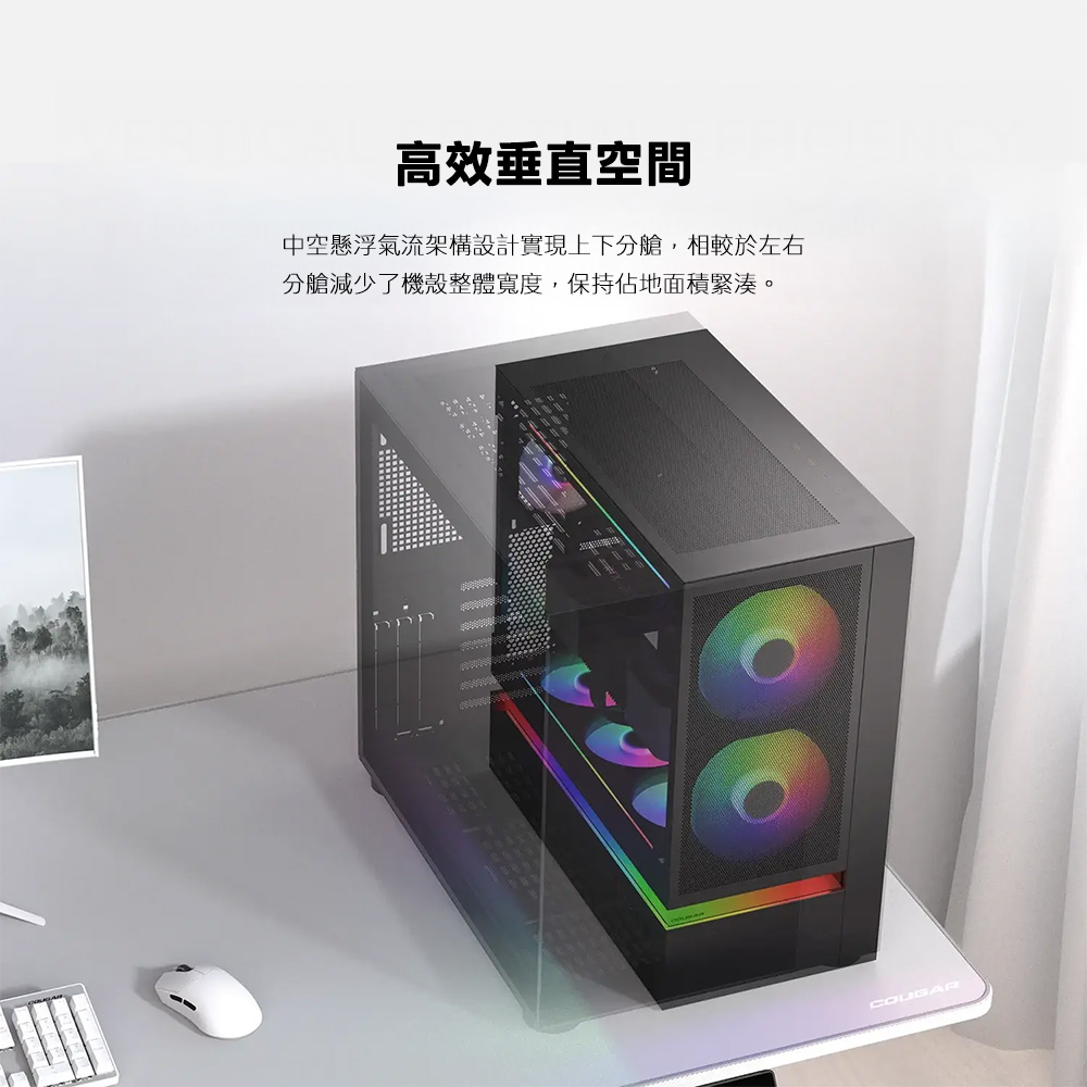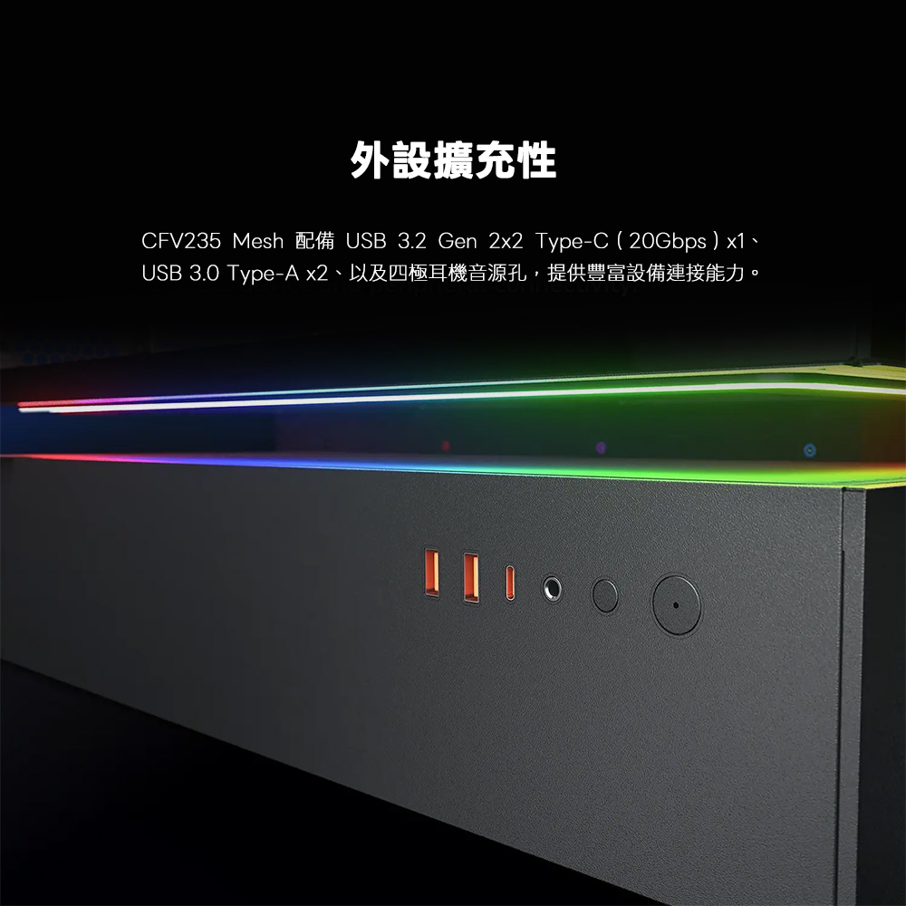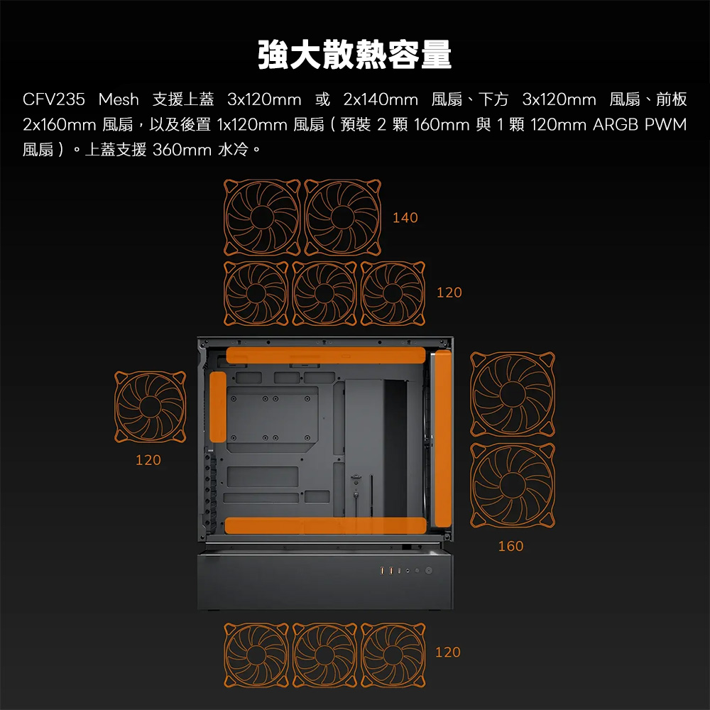 CFV235 Mesh 採用創新的中空懸浮氣流架構(Central Floating Ventilation, CFV),將電源艙與主艙室分離,並利用兩者之間的開放空間作為額外的散熱通道,不僅保留精巧機身尺寸,更在空間設計實現高效通風性能。搭配 3 合 1 前面板模組(網孔面板 + 雙 160mm ARGB PWM 風扇 + 防塵濾網),CFV235 Mesh 結合極致散熱與沉浸視覺,帶來前所未有的氣流體驗。