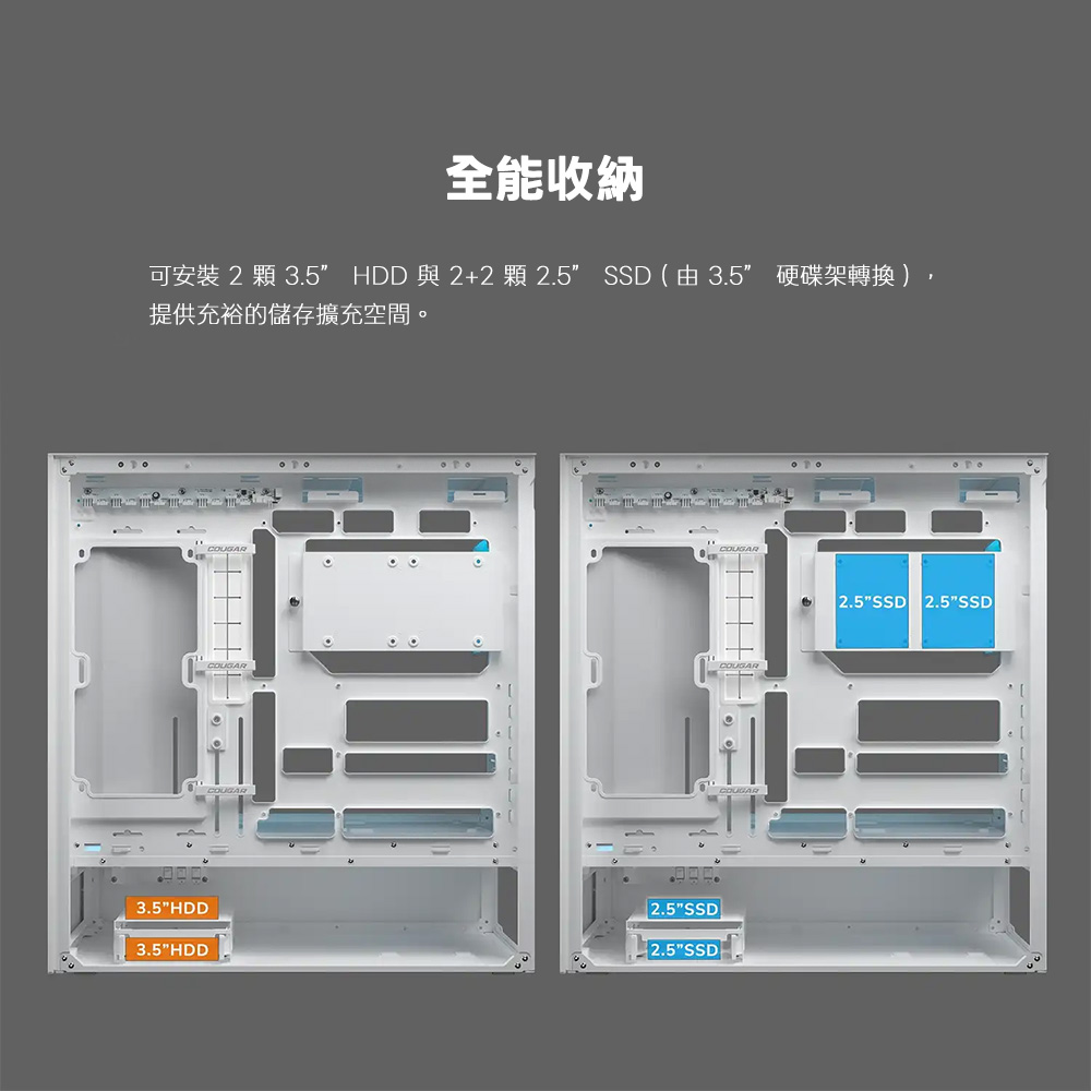 7、支援 2 個 3.5 吋 HDD 與 2+2個 2.5 吋 SSD(可由 3.5 吋硬碟位轉換)