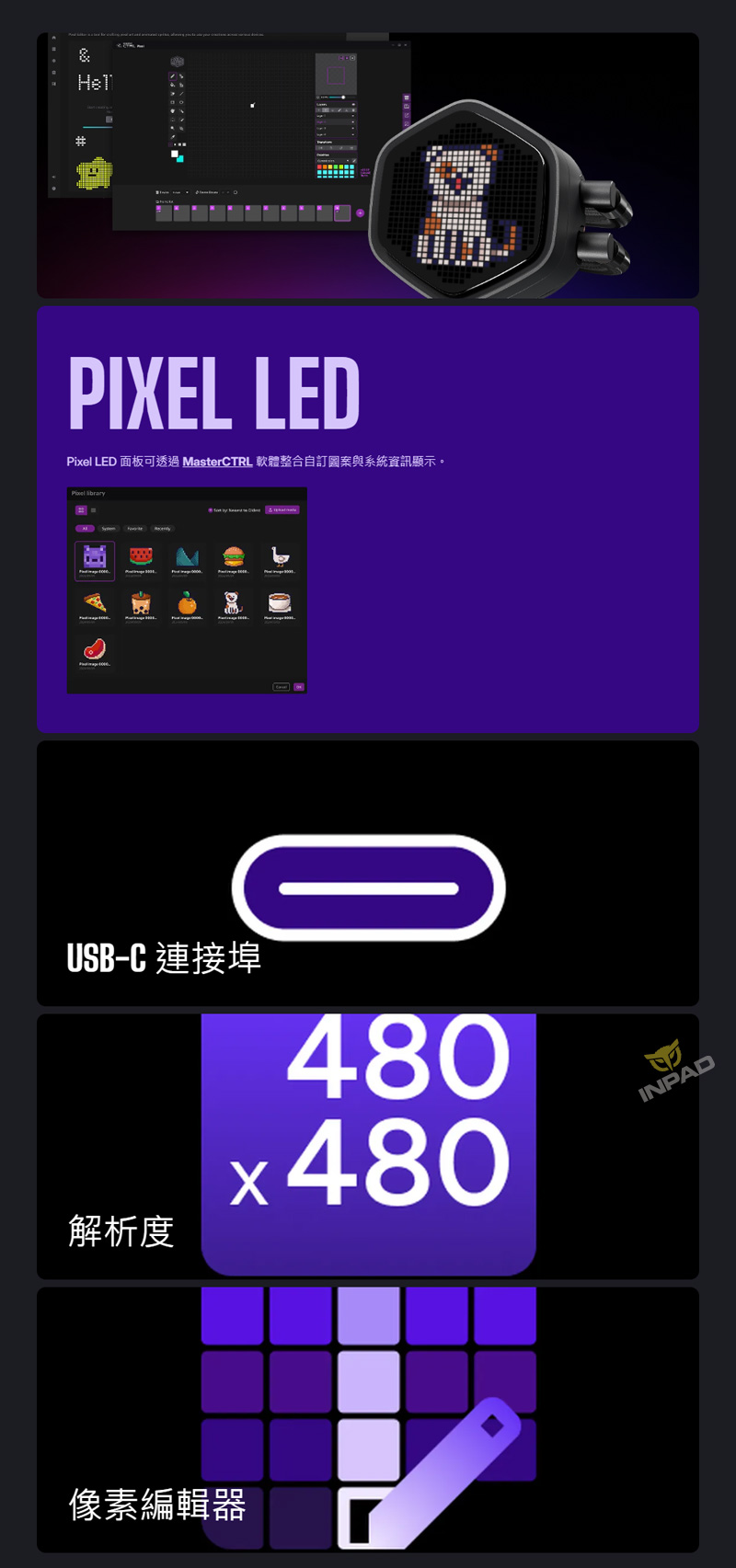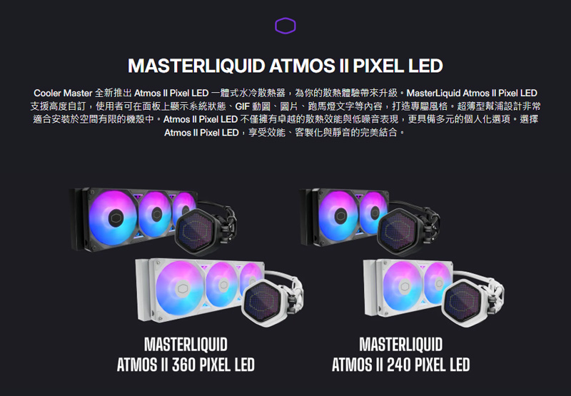 Cooler Master 全新推出 Atmos II Pixel LED 一體式水冷散熱器,為你的散熱體驗帶來升級。MasterLiquid Atmos II Pixel LED 支援高度自訂,使用者可在面板上顯示系統狀態、GIF 動圖、圖片、跑馬燈文字等內容,打造專屬風格。超薄型幫浦設計非常適合安裝於空間有限的機殼中。Atmos II Pixel LED 不僅擁有卓越的散熱效能與低噪音表現,更具備多元的個人化選項。選擇 Atmos II Pixel LED,享受效能、客製化與靜音的完美結合。