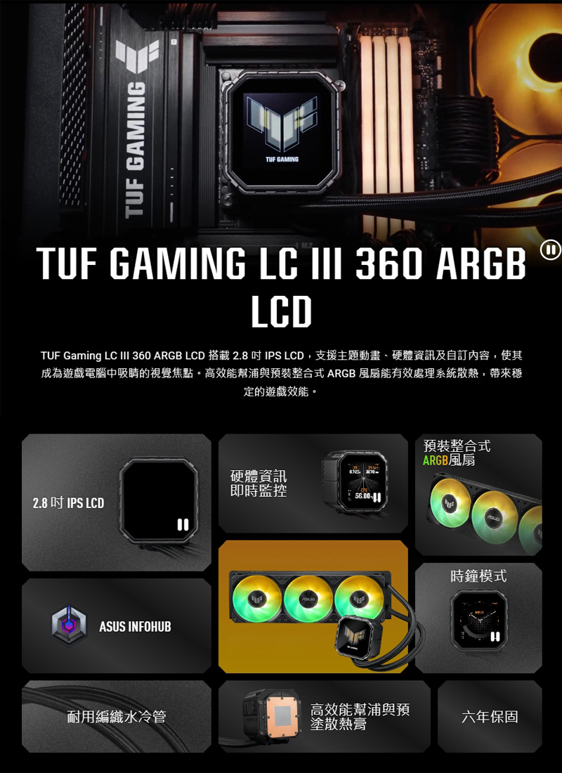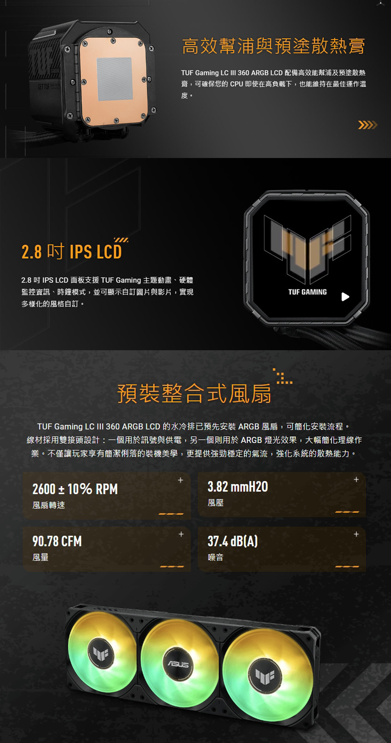 品名: | ASUS 華碩 TUF GAMING LC III 360 ARGB LCD 一體式水冷散熱器 |