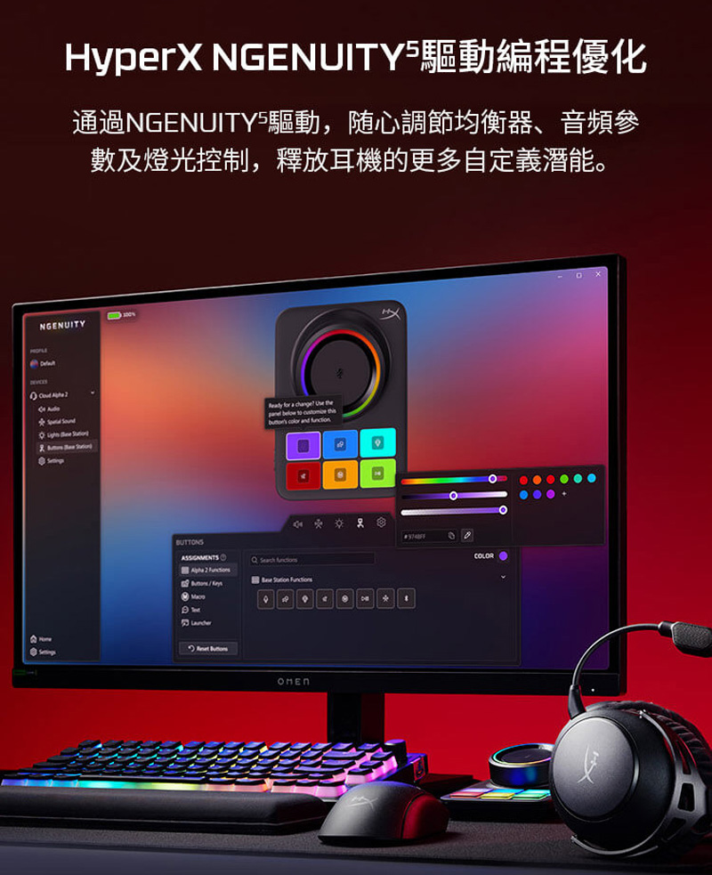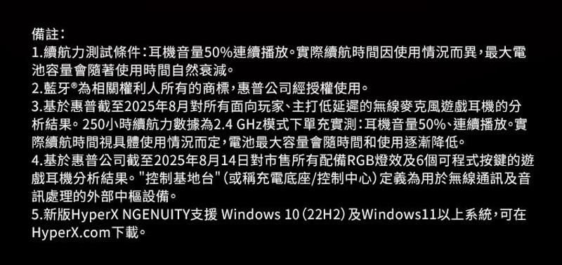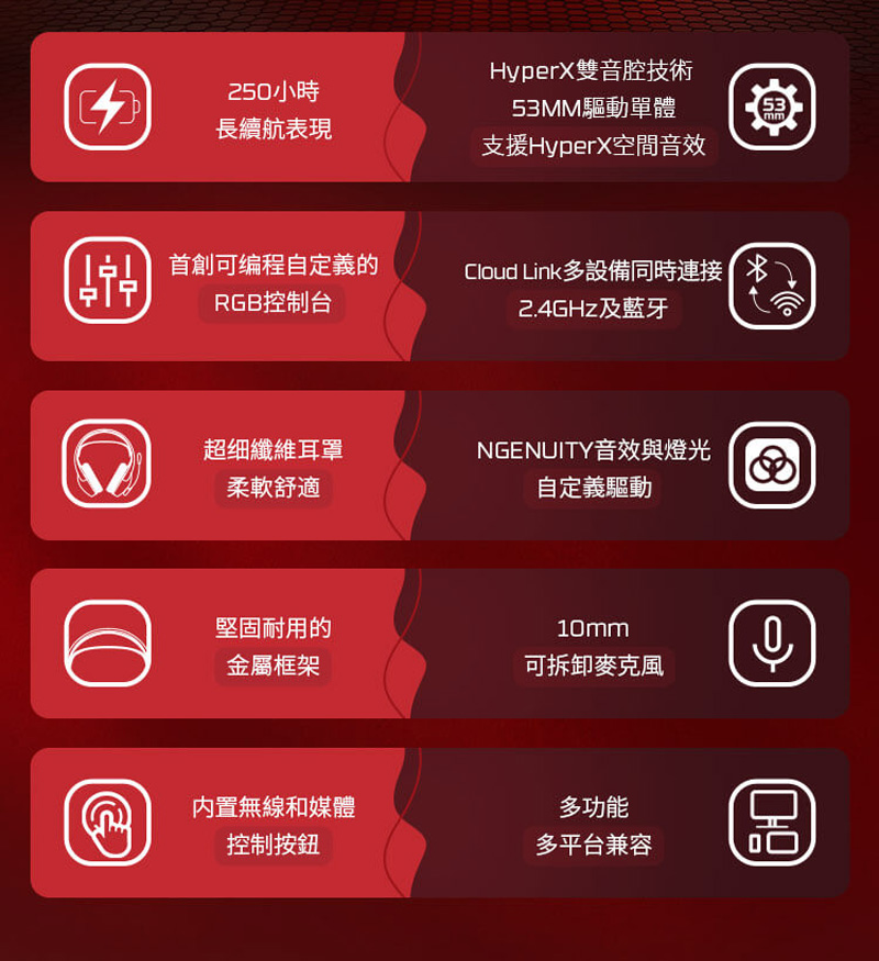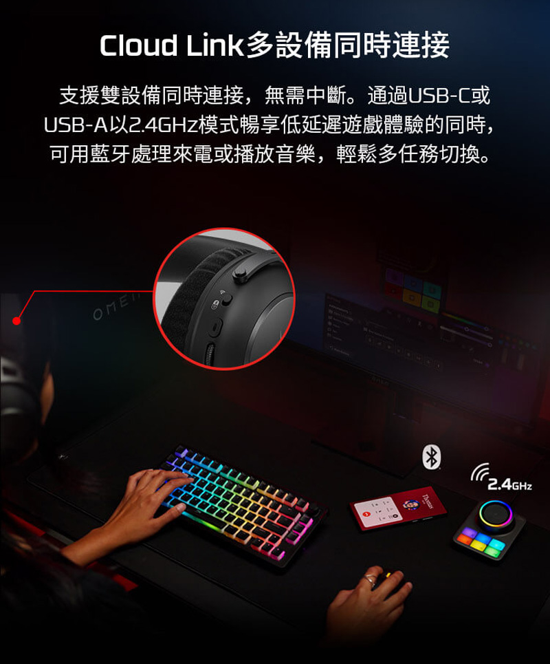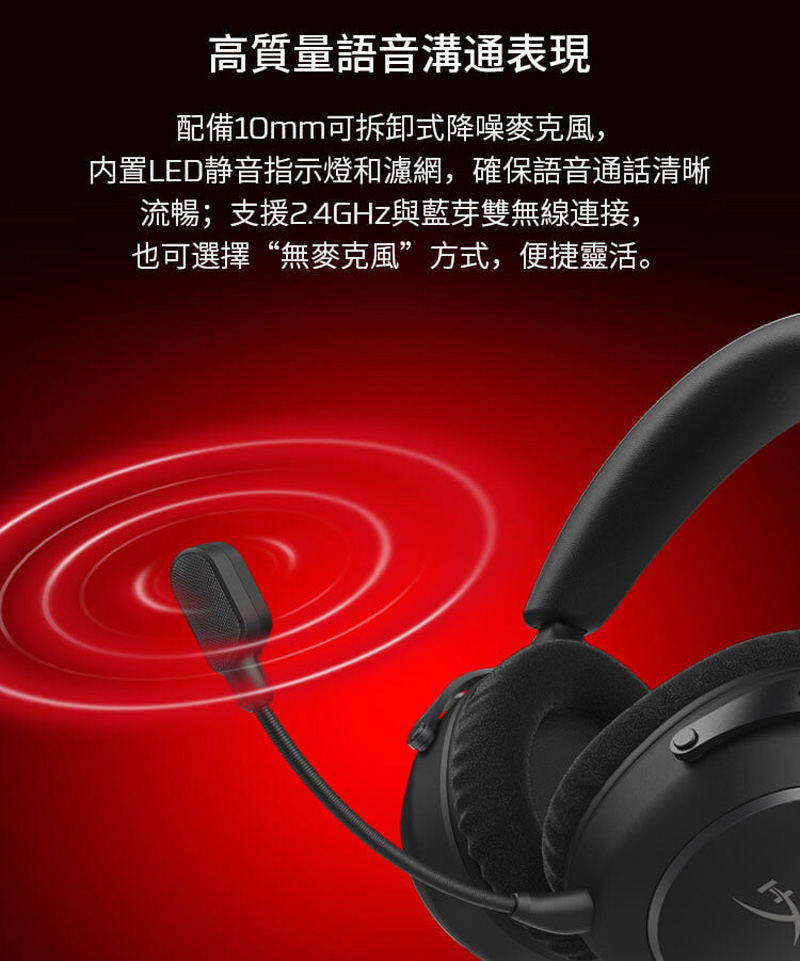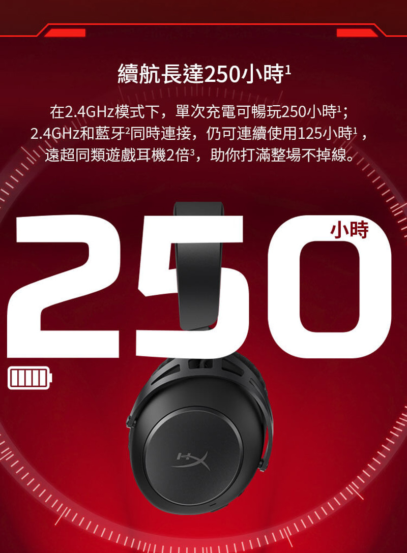 沉浸每個細節,掌控全局-HyperX Cloud Alpha 2 Wireless 精準還原每一下腳步聲、槍聲與技能提示,助您搶先開火。 業界領先250小時續航,為競品2倍,大幅減少充電中斷;長時激戰依舊穩定,HyperX Cloud Alpha 2 Wireless 讓您專注致勝。多層53 mm雙音腔驅動單體,提供高傳真沉浸式音效:低音深沉、高音清脆,遊戲臨場感更強烈;搭配HyperX NGENUITY空間音效,方位判斷零失誤。可自訂RGB 底座,即音頻指揮中心,一鍵切換設定與裝置,操作較為直覺。 首款可程式RGB 底座,專為無線電競耳機設計,支援燈效、按鍵與巨集自訂。遊戲、直播或多工作業皆宜,HyperX Cloud Alpha 2 Wireless 提供卓越效能與全天候舒適。同步2.4 GHz與藍牙-HyperX Cloud Alpha 2 Wireless 讓您邊遊戲邊聽音樂或接聽電話,雙裝置同時連線不中斷。