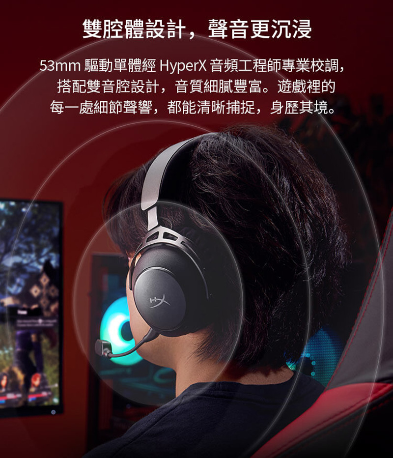 6、多層53mm雙音腔驅動單體,支援HyperX NGENUITY空間音效