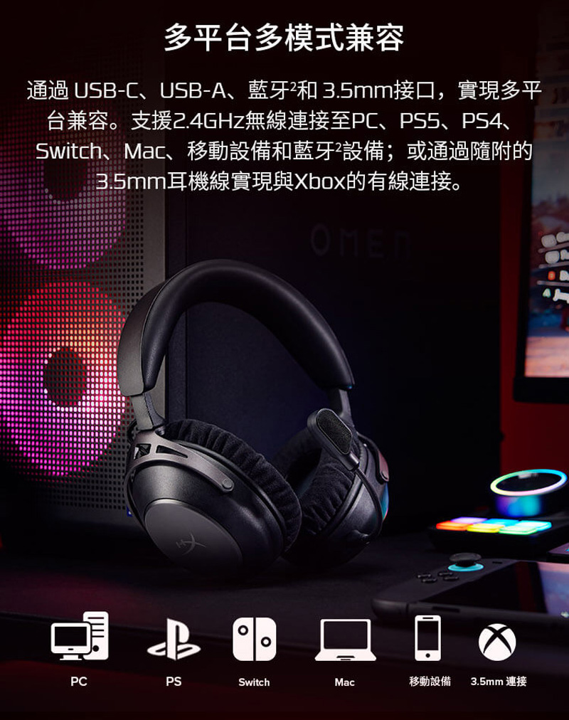 連接介面: | 2.4GHz 無線 USB、Bluetooth、4 極 3.5mm 有線 USB 音訊格式:立體聲播放、單聲道麥克風 USB 規格:USB 2.0 |