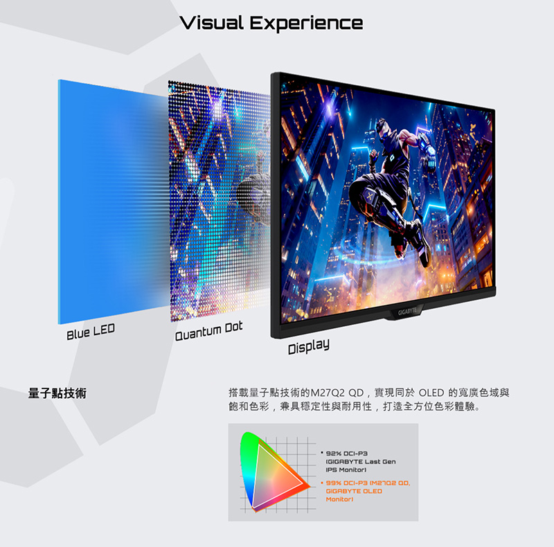 M27Q2 QD ICE 擁有與 GIGABYTE OLED 螢幕相同的 99% DCI-P3 廣色域,呈現媲美 OLED 的鮮豔色彩。其 83% BT.2020 色域幾乎與最新第 4 代 WOLED 的 84% 相當,為遊戲帶來極致震撼的色彩表現。