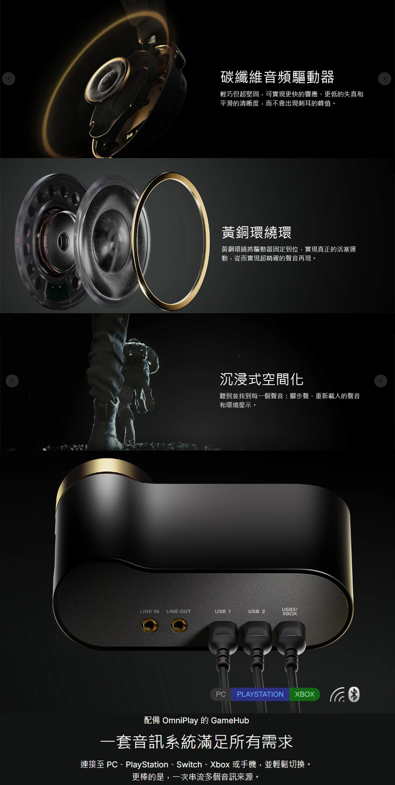 連接介面: | USB-C to USB-A 2.4 GHz 藍牙V5.3 + LE音訊 (SBC支援多點連接,最多可儲存10組裝置。LE音訊支援LC3、LC3+編碼) 3.5mm 同步音訊OmniPlay:支援最多4個音源:USB1 + USB2 (或USB3)+ 藍牙 + 線路輸入 |