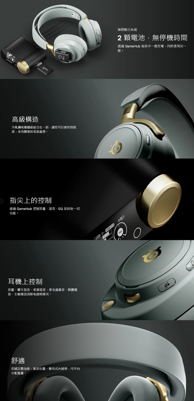 耳罩控制鍵: | 音量/語音混音旋鈕、音源混音鍵、電源/配對/快速切換鍵、靜音鍵、藍牙媒體控制鍵。多功能滾輪可遠端全面操控GameHub |