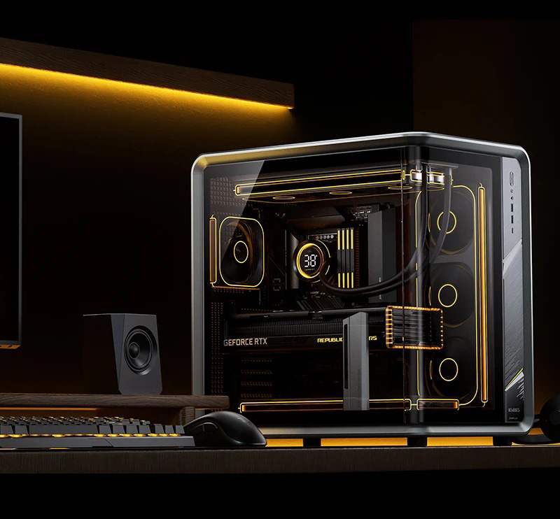 13、270° 全景透視玻璃側窗,無中柱設計 + 一體彎折強化玻璃,展示硬體燈效極致無遮擋