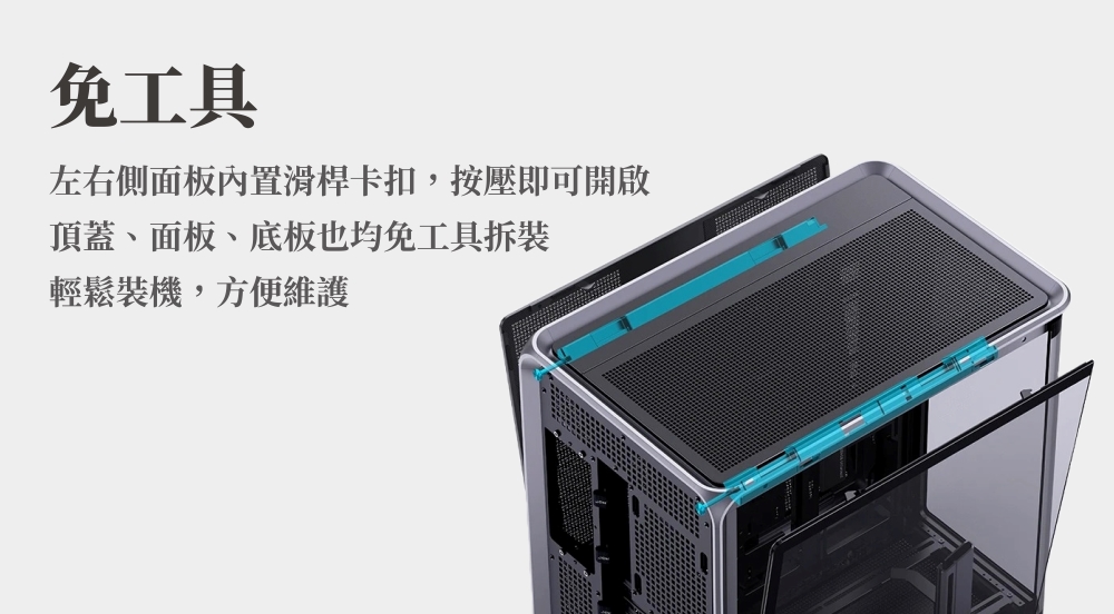 10、無工具快速拆裝,滑桿卡扣結構,按壓即可拆卸頂蓋、面板和底板,方便裝機與維護