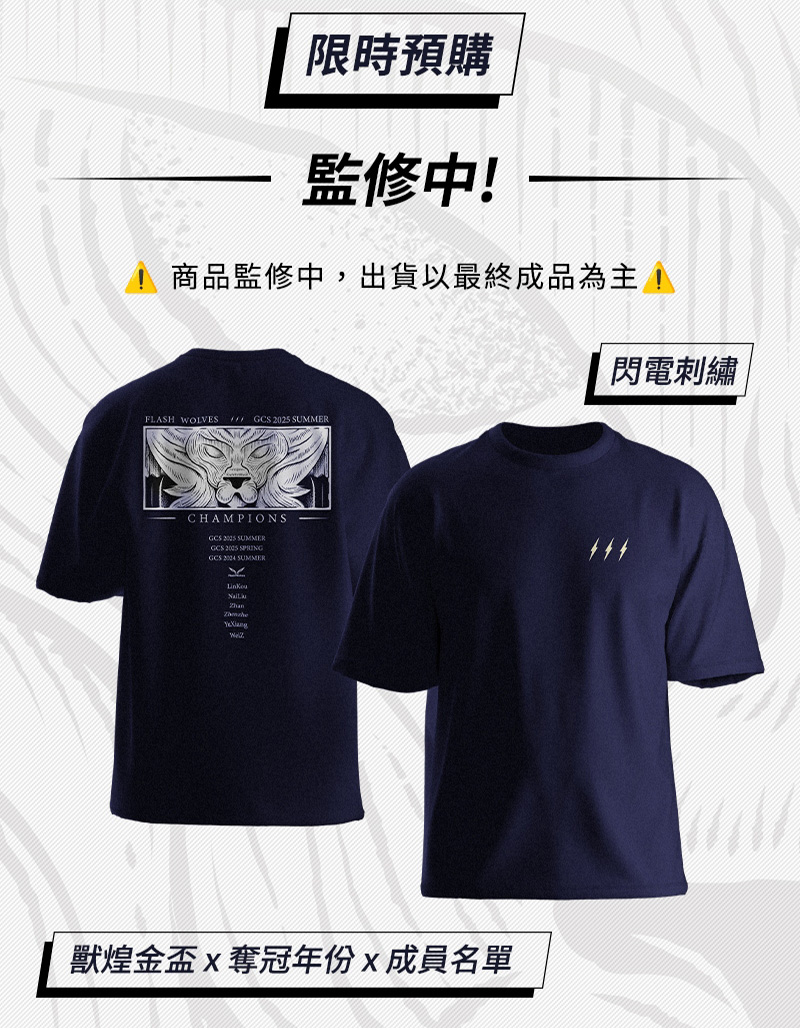 為慶祝閃電狼《傳說對決》項目團隊 GCS 三連霸成就,締造隊史嶄新里程碑。為紀念這份榮耀時刻,推出限定紀念 T 恤。