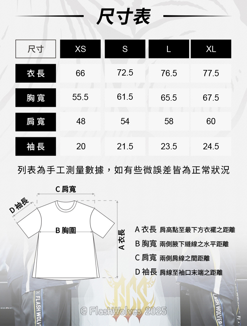 ※本款短 T 為中性寬鬆版型,請參照平日穿著服飾對照尺寸表選購。