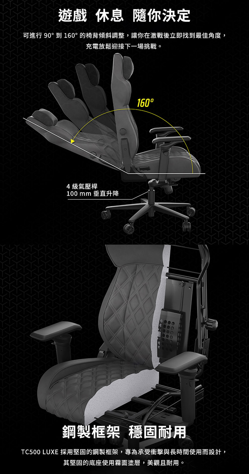1、與一般遊戲椅相比,TC500 LUXE更寬敞、更平坦,適合多種體型和坐姿<br />
