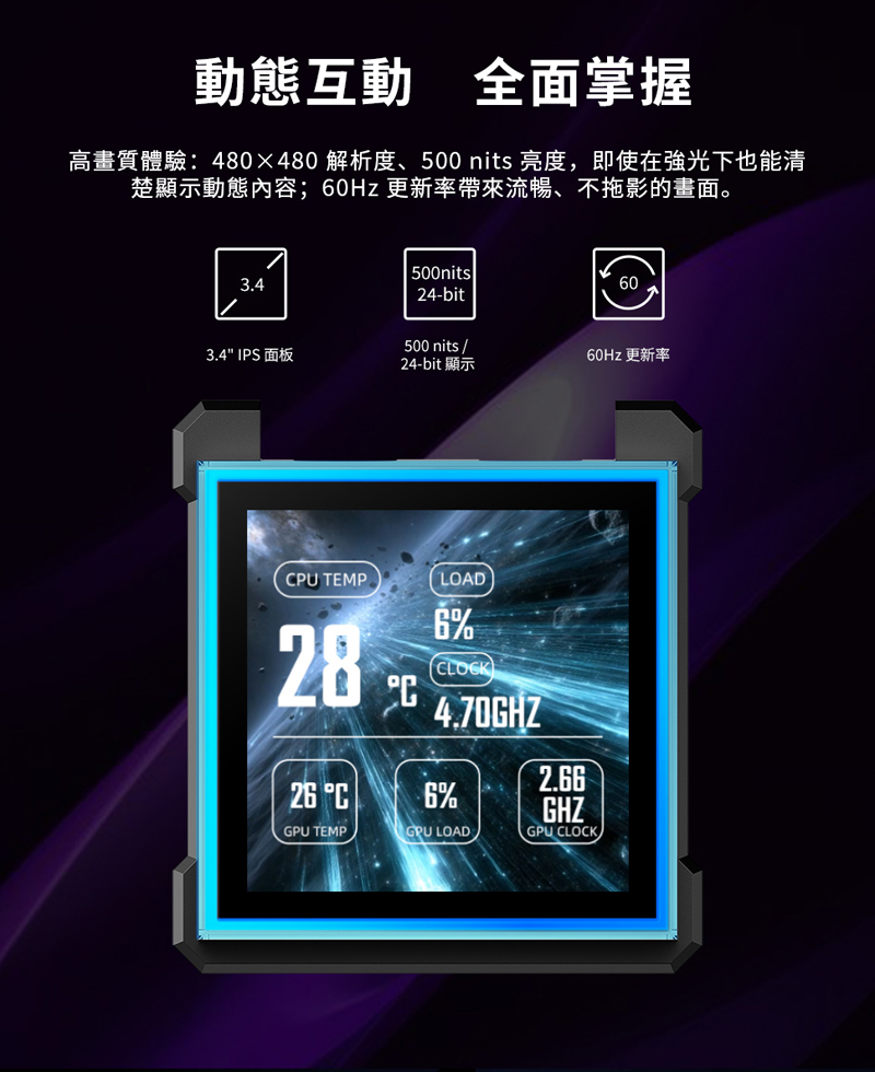 5、3.4 吋 IPS LCD,480 × 480 解析度、500 nits 高亮度