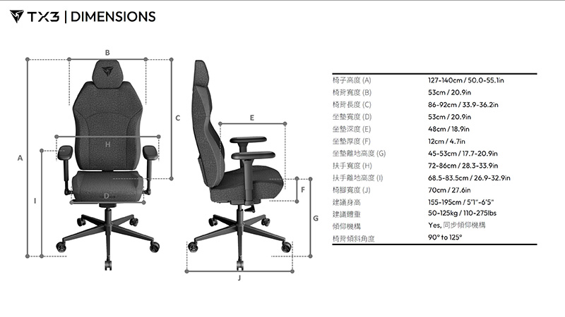 | 椅背調整角度: | 90°~125° |