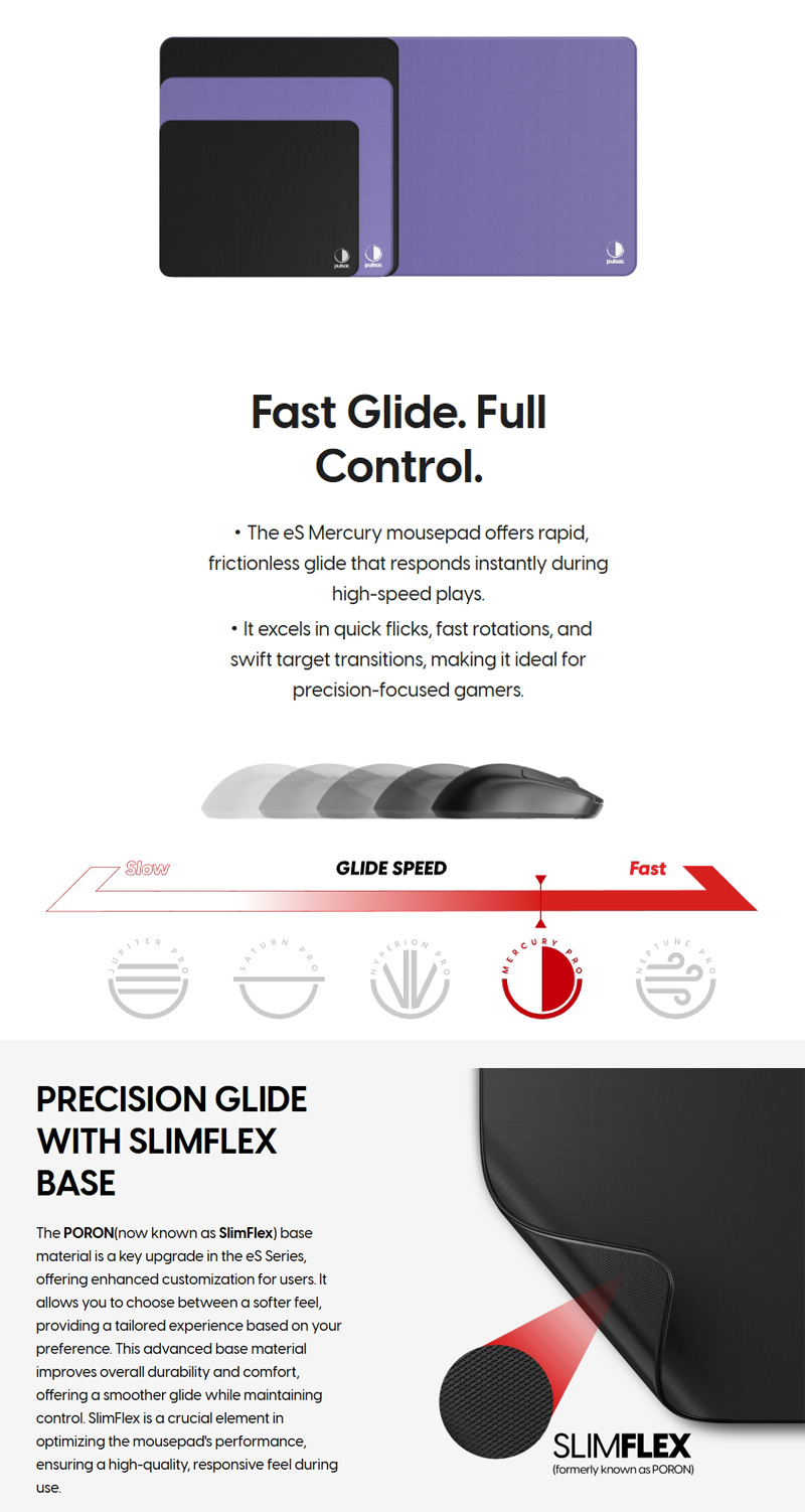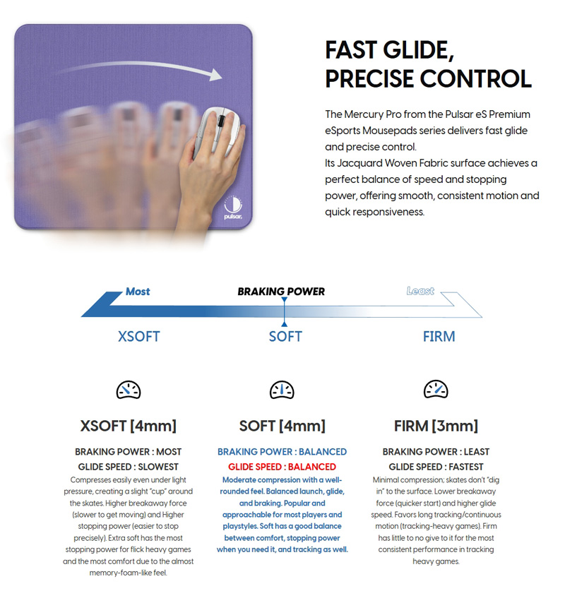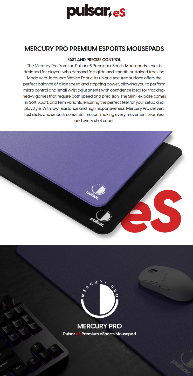Pulsar eS 高階電競滑鼠墊系列中的 Mercury Pro 專為追求快速滑動和流暢穩定追蹤的玩家而設計。它採用提花編織面料,獨特的紋理表面完美平衡了滑動速度和煞車性能,讓您能夠自信地進行微調和手腕細微移動,尤其適合需要速度和精準度的追蹤類遊戲。 SlimFlex 底座提供軟、超軟和硬三種選擇,確保滿足您的不同設定和遊戲風格。 Mercury Pro 擁有低阻力和高反應速度,帶來快速點擊和流暢一致的行動體驗,讓每一次操作都流暢自如,每一次擊殺都至關重要。