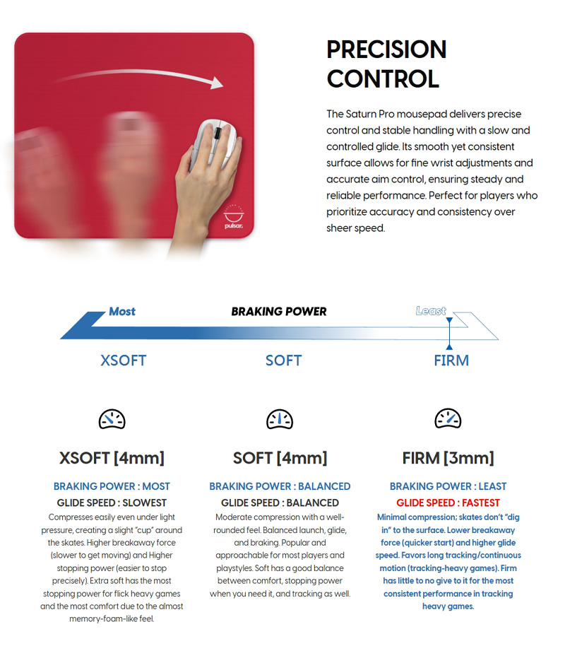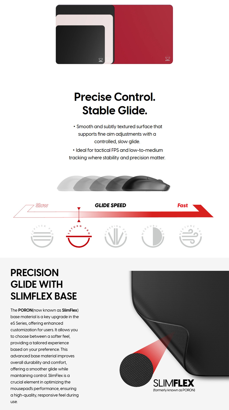 Saturn Pro 是一款專為注重精準度和穩定性的玩家打造的高階電競滑鼠墊。它採用光滑且紋理細膩的圓形針織面料,方便進行微調,並提供穩定、可控的滑動體驗。其緩慢的滑動特性使其成為戰術性 FPS 遊戲以及對瞄準精度要求較高的中低追蹤遊戲的理想之選。 SlimFlex 底座提供軟、超軟和硬三種選擇,可根據您的喜好和設定提供完美的觸感和精準的操控。 Saturn Pro 具有低阻力和一致的表面紋理,確保每次滑動都流暢、穩定且一致。
