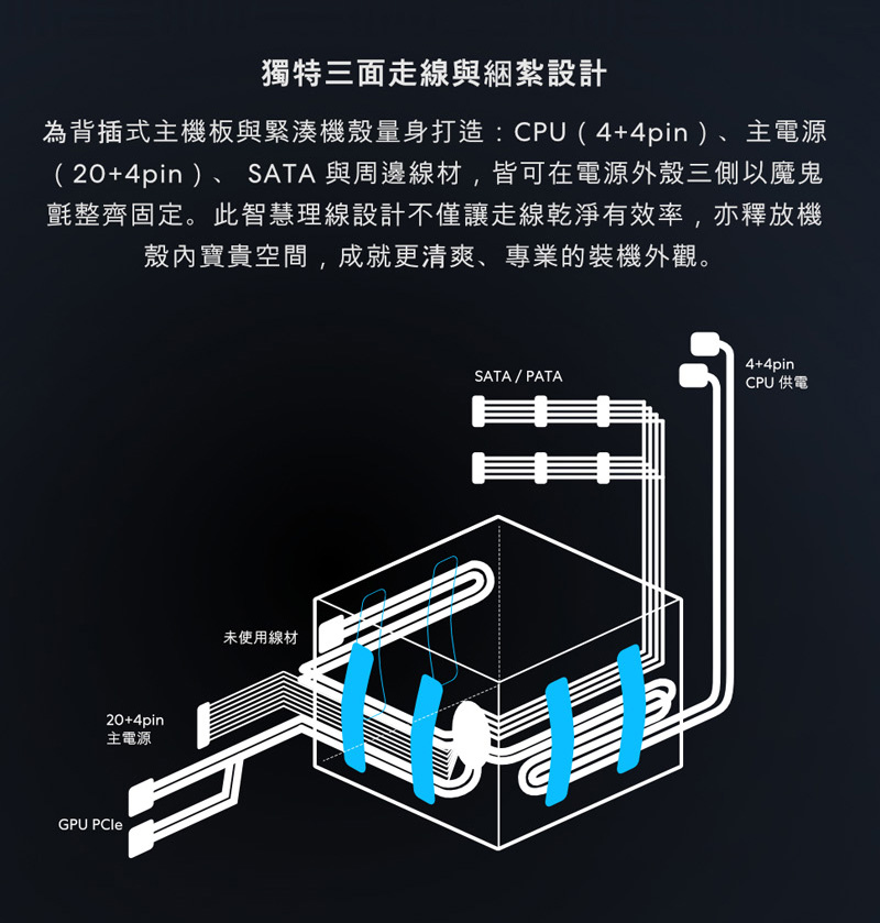 1、專為後連接器主機板設計的三面電纜出口