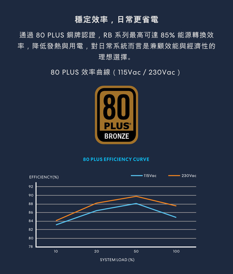 4、經過80 PLUS銅牌認證,日常系統效率高達85%
