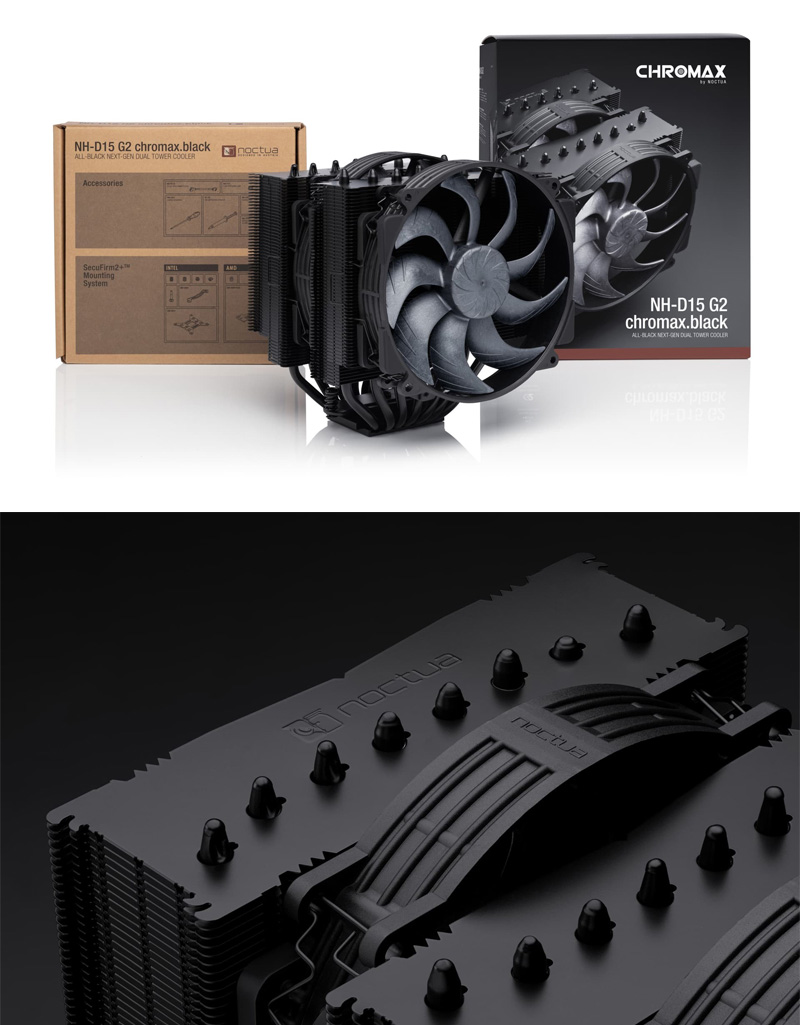 靜音散熱性能,展現黑色風範:屢獲殊榮的旗艦級散熱器 NH-D15 G2 的 chromax.black 版本。