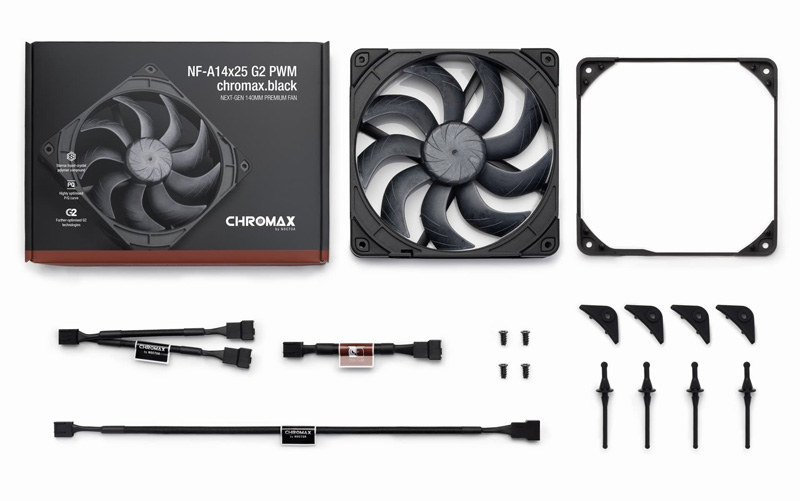 | 包裝內容物: | NF-A14x25 G2 PWM CH.BK風扇 NA-RC16 低噪音轉接器 (L.N.A.) NA-YC1 chromax.black 4針PWM分線器線纜 NA-EC1 chromax.black 30cm延長線 4個 NA-AV2 chromax.black 防震支架 NA-AVG2-LR chromax.black 防震墊片 4個 NA-AVP1-LR chromax.black 避震墊 黑色風扇螺絲 |