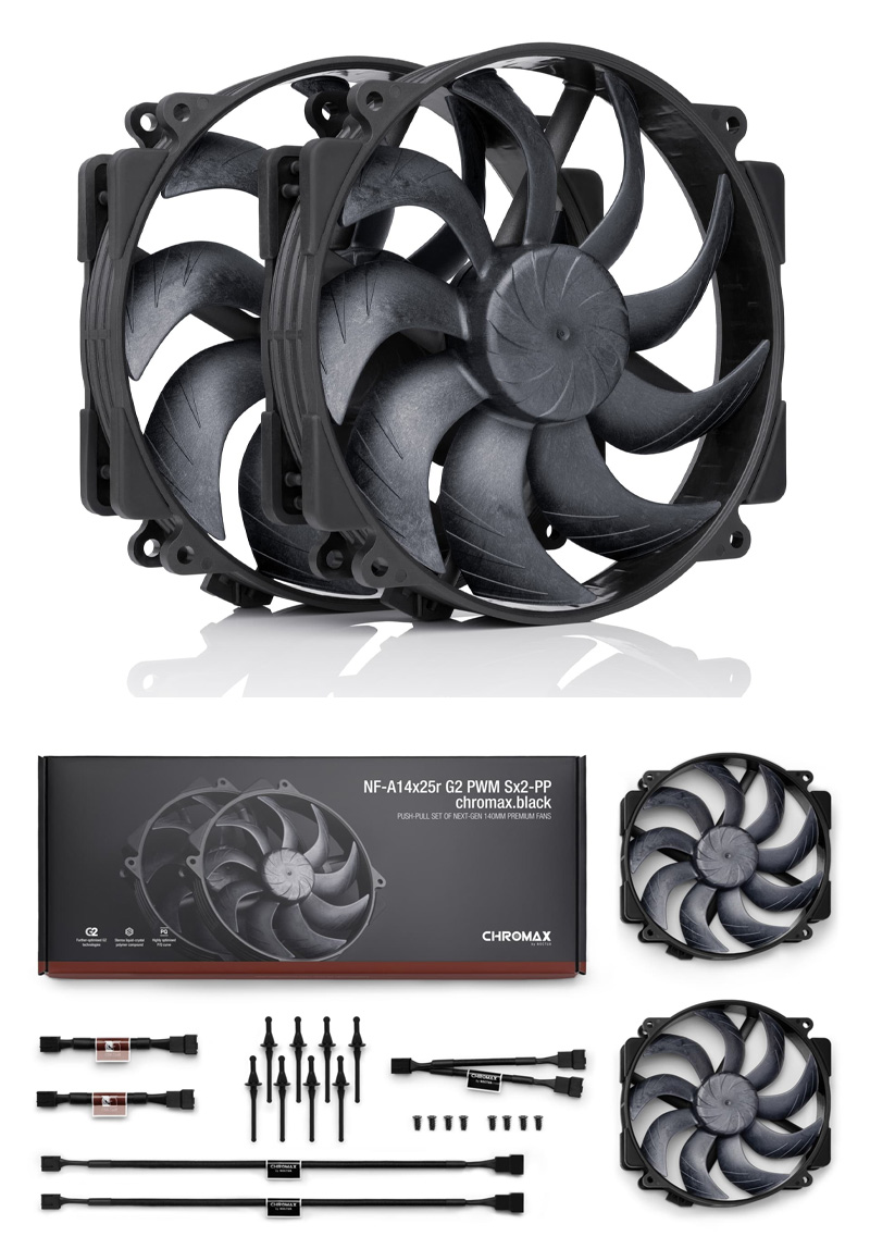| 包裝內容物: | NF-A14x25r G2 PWM PPA chromax.black NF-A14x25r G2 PWM PPB chromax.black 2 個 NA-RC16 低噪音轉接器 (L.N.A.) NA-YC1 chromax.black 4 針 PWM 分線器 2 條 NA-EC1 chromax.black 30cm 延長線 8 個 NA-AV2 chromax.black 防震墊 黑色風扇螺絲 |