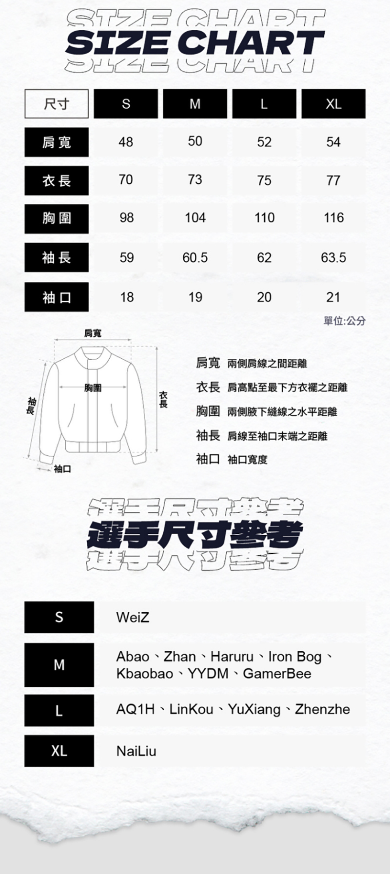 此款外套為中性版型,請參照平日穿著服飾對照,或是對照選手尺寸表選購。