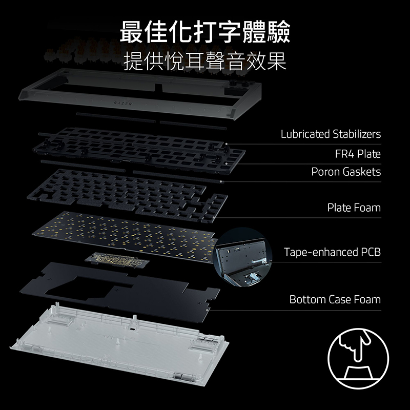 10、採用以襯墊固定的 FR4 定位板、膠帶強化的 PCB、經過潤滑的穩定器,以及兩層吸音泡棉