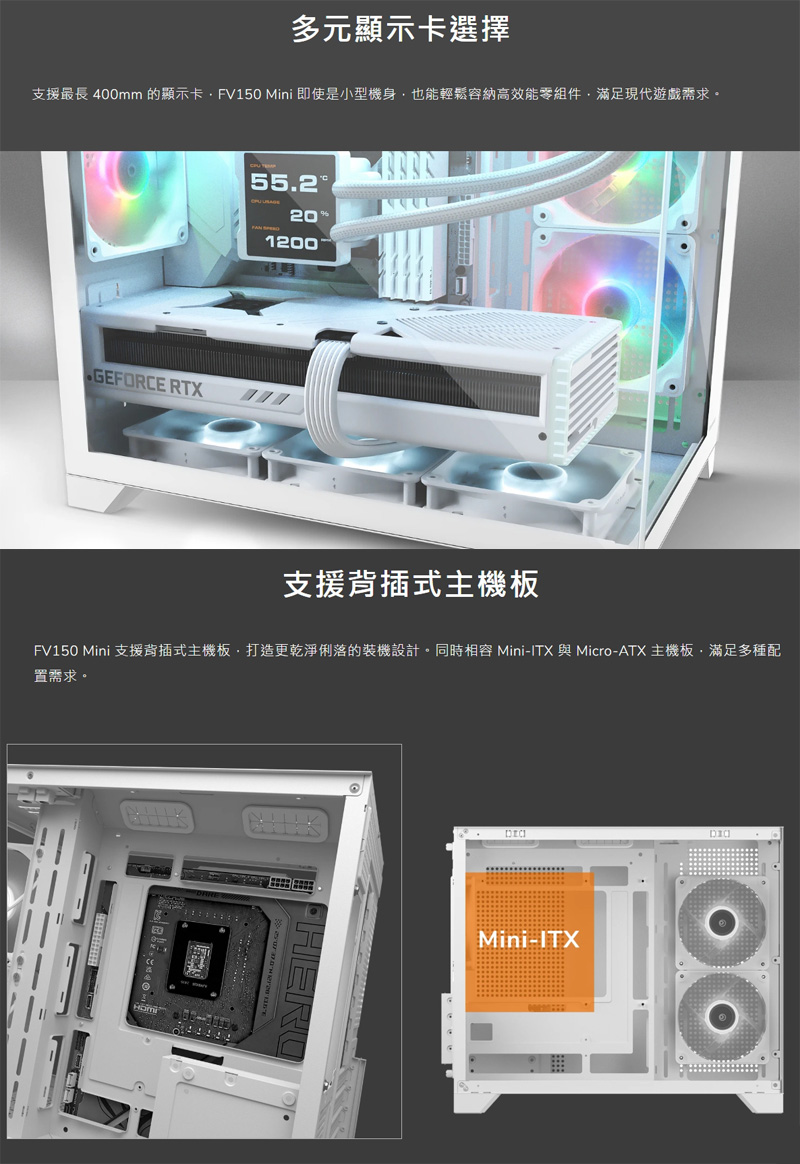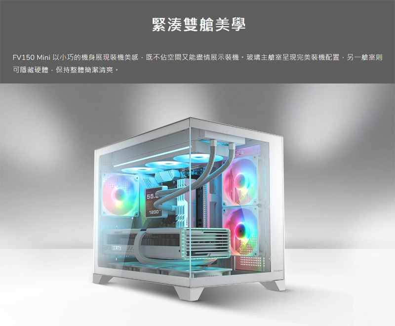 FV150 Mini 將雙艙的美學與功能濃縮在小巧機身中,完美適用於空間受限的環境。玻璃面板的主艙室展現清晰可見的裝機視覺,而副艙體則巧妙隱藏硬體設備與線材。此外,支援背插式主機板,實現零線材的乾淨安裝。