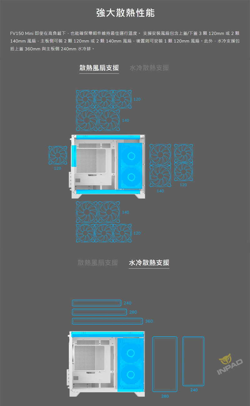 | 支援水冷: | 上蓋:360mm / 280mm / 240mm 主板側:240mm / 280mm |