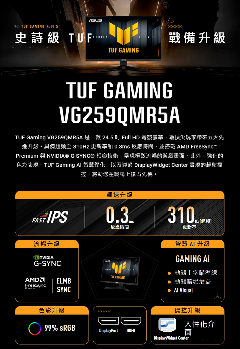 TUF Gaming VG259QMR5A 是一款 24.5 吋 Full HD 電競螢幕,為頂尖玩家帶來五大先進升級。具備超頻至 310Hz 更新率和 0.3ms 反應時間,並搭載 AMD FreeSync™ Premium 與 NVIDIA® G-SYNC® 相容技術,呈現極致流暢的遊戲畫面。此外,強化的色彩表現、TUF Gaming AI 智慧優化,以及透過 DisplayWidget Center 實現的輕鬆操控,將助您在戰場上搶占先機。