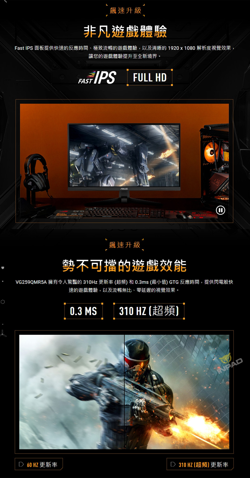 4、ASUS Fast IPS 技術可達到 0.3ms (GTG) 反應時間 (最小值),以高畫面播放速率提供清晰的遊戲視覺效果