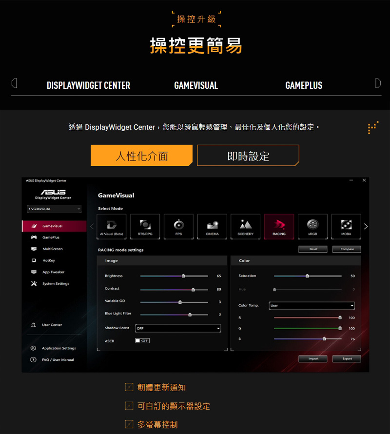 3、DisplayWidget Center 可讓您使用滑鼠輕鬆存取 OSD 選單及調整顯示器設定