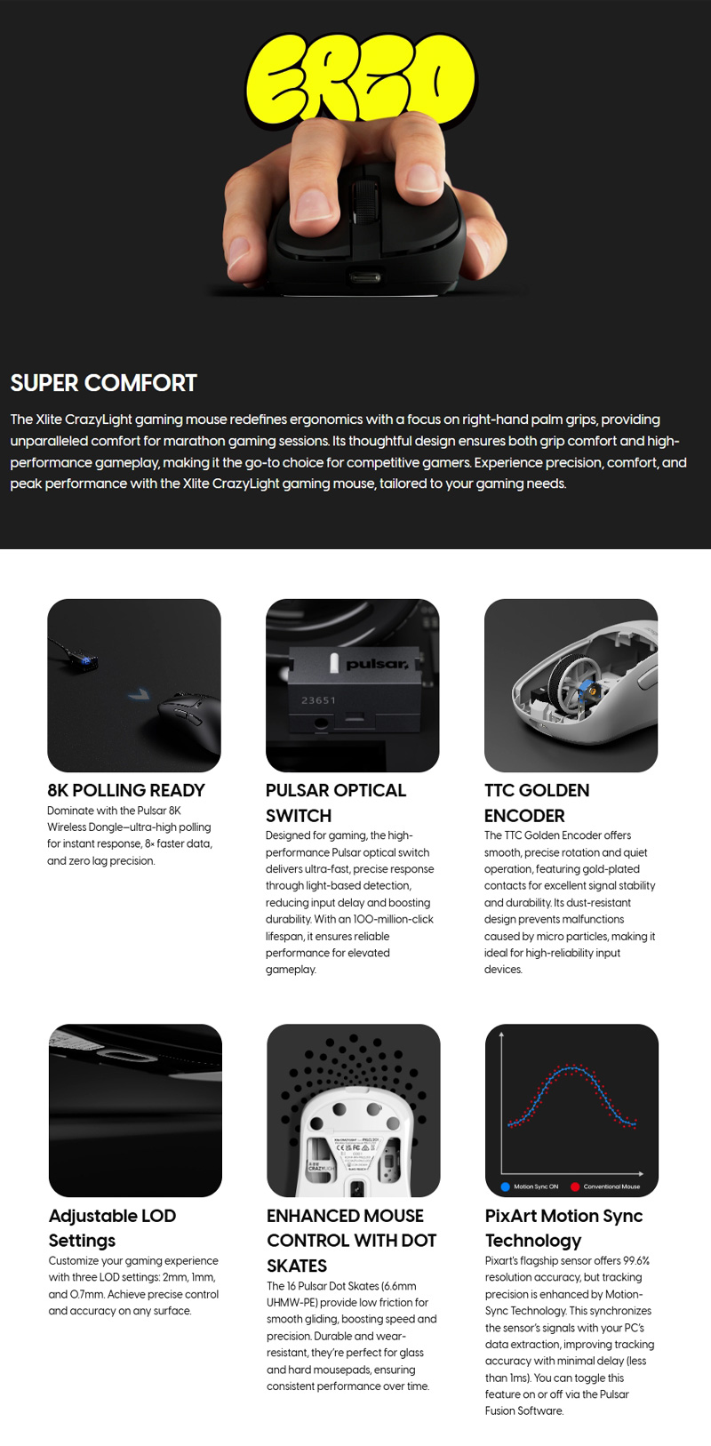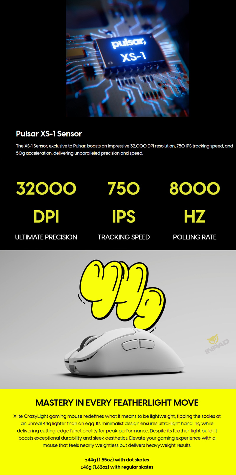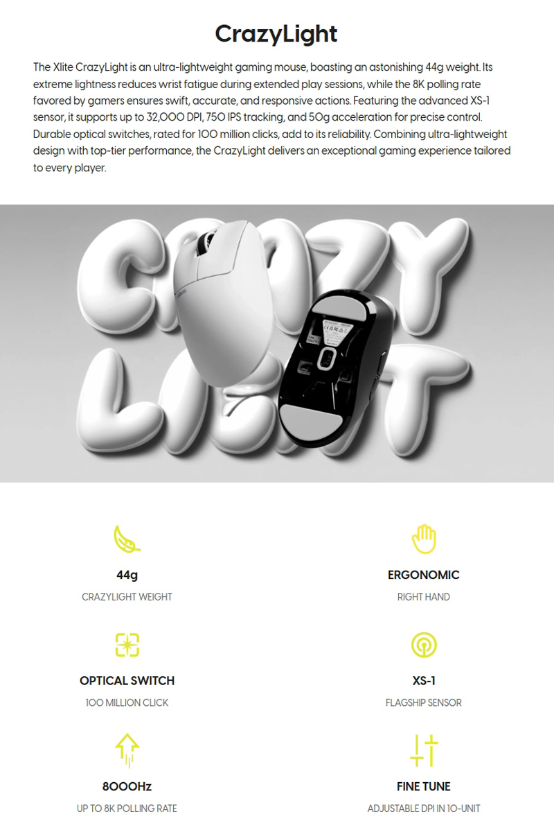 Xlite CrazyLight 是 Pulsar 經典 Xlite 的精緻進化版本,以僅 44 克的超輕量設計實現頂尖效能。