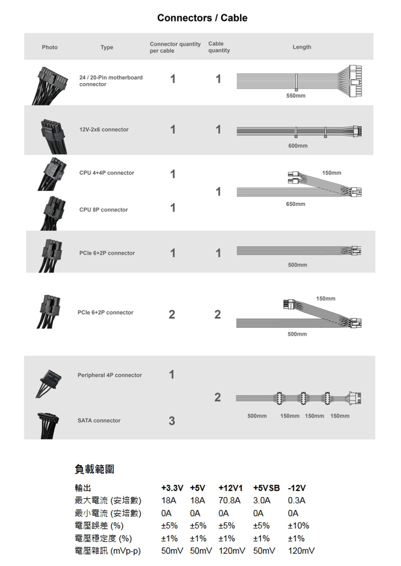 | 線材接頭: | 1 x 24 / 20-主機板接頭 2 x 8 / 4-Pin EPS / ATX 12V 接頭 1 x 12+4-Pin 12V-2x6接頭 5 x 8 / 6-Pin PCIe 接頭 6 x SATA 接頭 2 x 4-Pin Peripheral 接頭 |