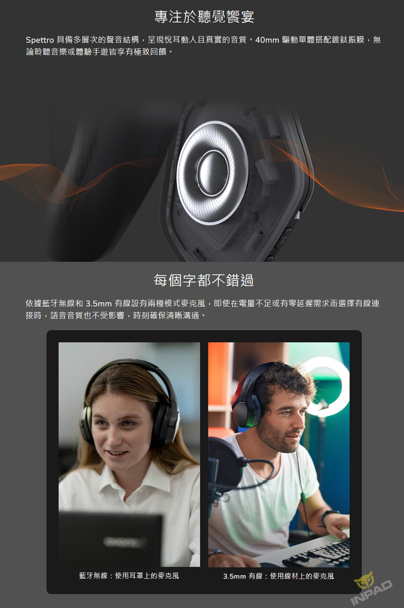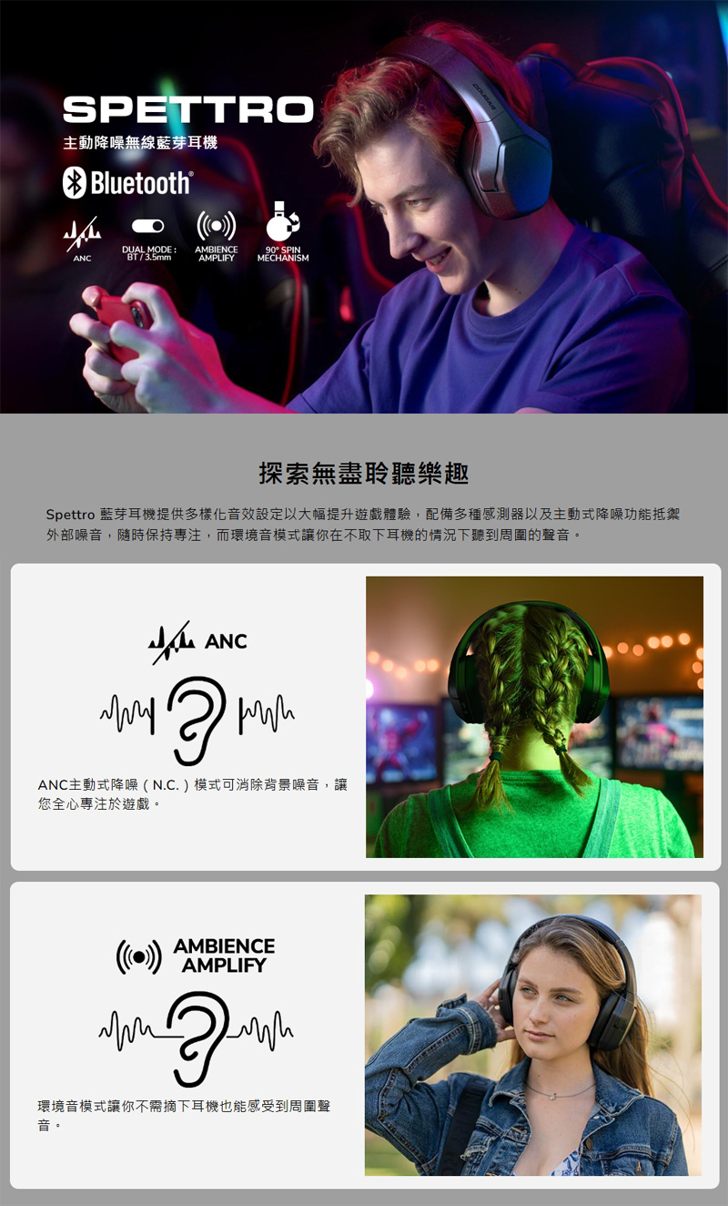 COUGAR Spettro 是一款經過 Bluetooth® 認證的無線耳機,具備 ANC 主動降噪,可因應不同場景切換一般、降噪或環境音模式。同時支援 3.5mm 有線連接,不僅能享受零延遲遊戲體驗,再搭配 EQ 調節和清晰的麥克風,是遊戲與日常生活使用的絕佳選擇!