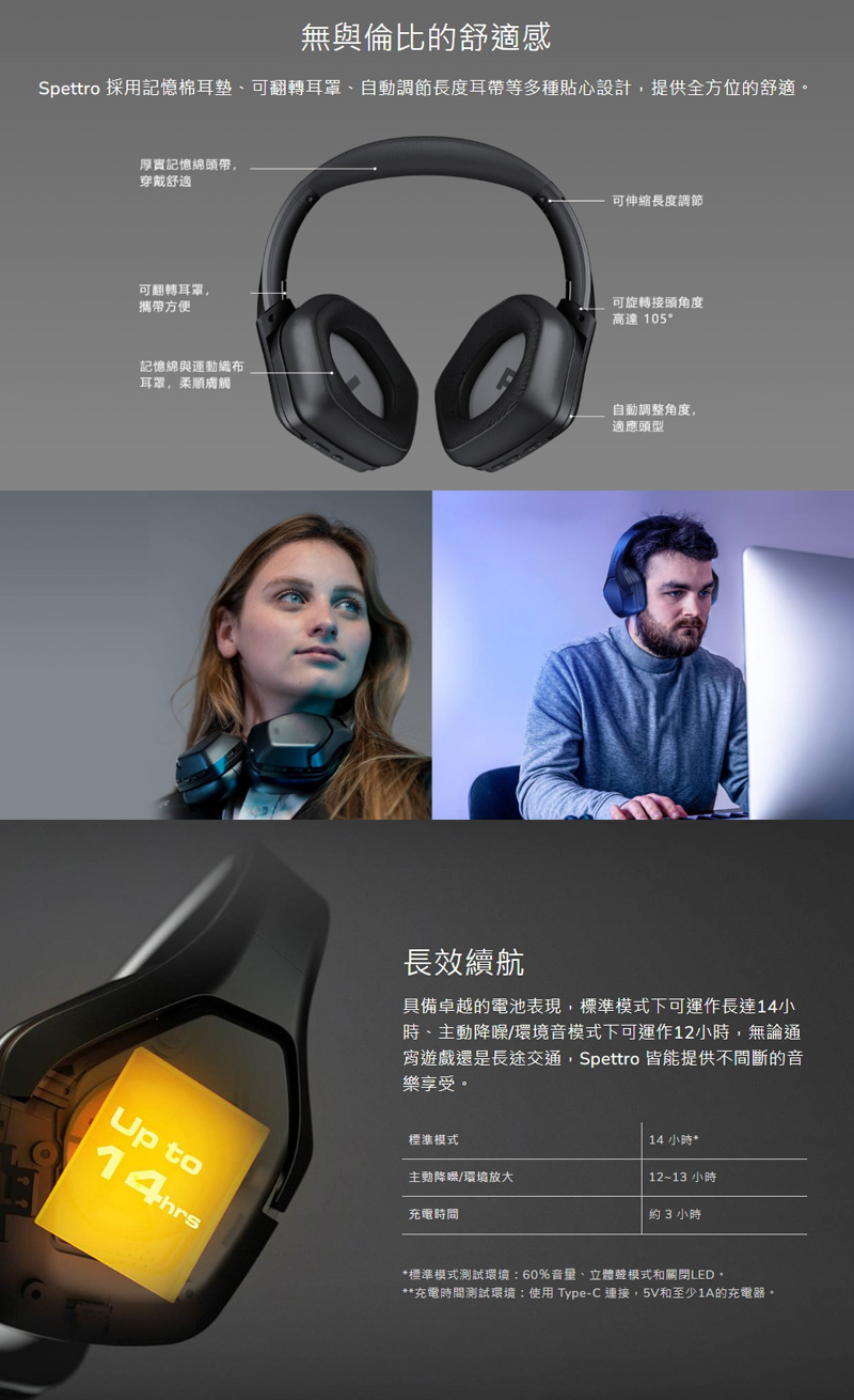 | 包裝內容物: | Spettro 耳機 耳機收納帶 使用說明書 USB Type-C to Type-A 充電線(1200mm ± 20mm) 3.5mm 4極音源線(1200mm ± 20mm) |