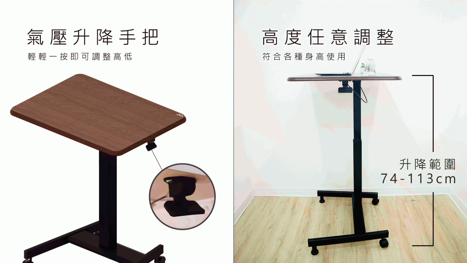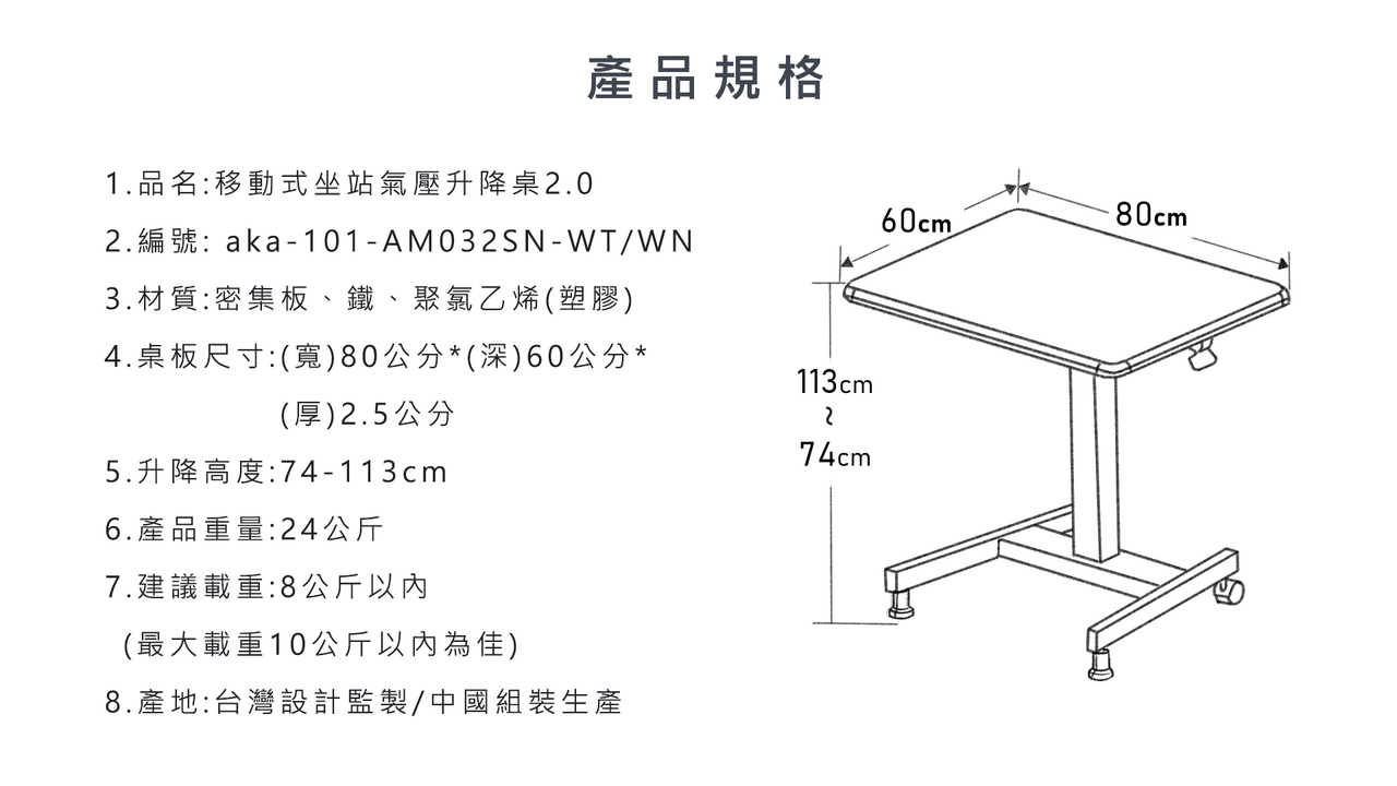 | 尺寸(長 x 寬 x 高): | 桌板:80 x 60 x 2.5 cm (長.寬.厚) 升降高度:74~113 cm |