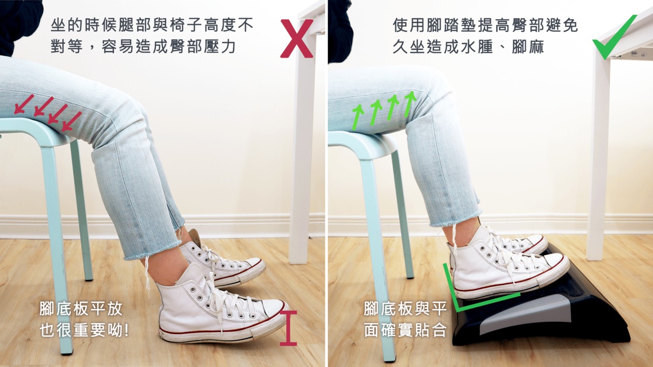 用了腳踏墊就可以改善坐姿,減輕臀部的壓力,讓雙腳更舒服。