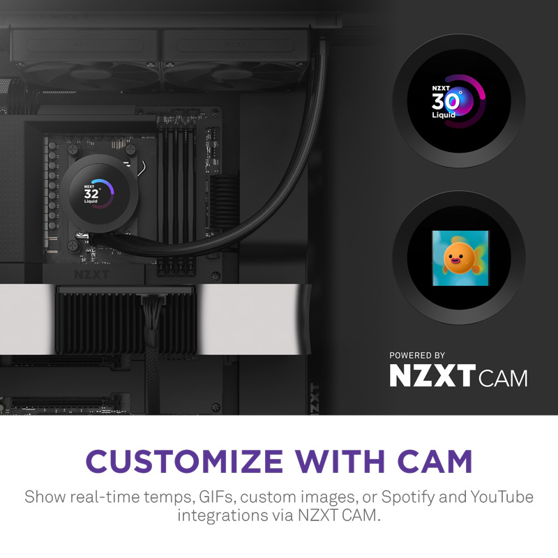 8、自訂液晶螢幕:在明亮的 1.54 吋方形液晶螢幕上顯示即時系統溫度、動畫 GIF、自訂圖像或 Spotify 和 YouTube 等網路整合內容——可透過 NZXT CAM 軟體完全自訂。