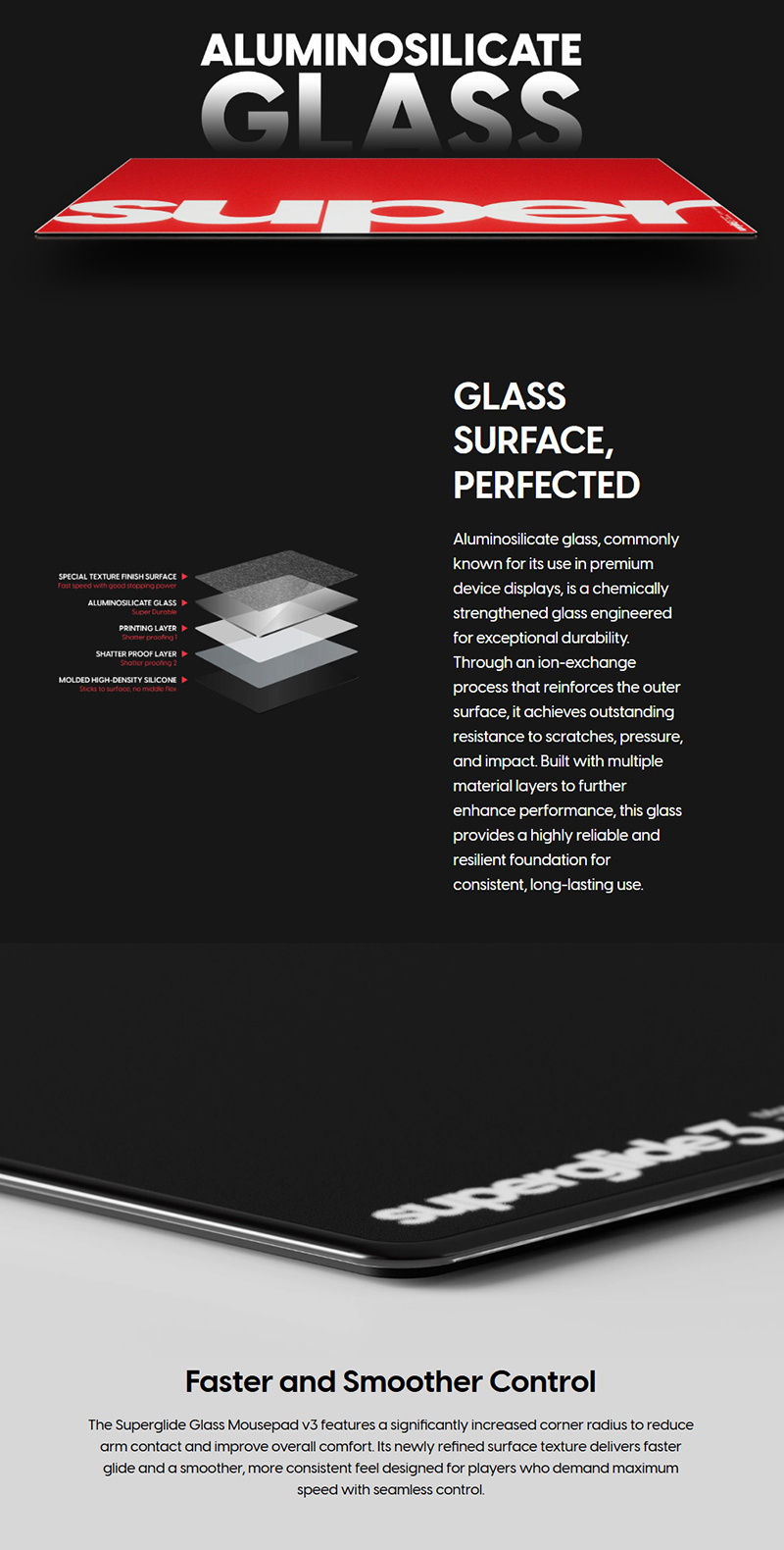 極致的效能以及耐用性,表面採用的是超耐用的鋁矽酸玻璃,可以實現快速滑行以及良好的停頓,並帶有獨特的表面圖案,底層是採用高密度的矽膠,可確保牢固防滑。