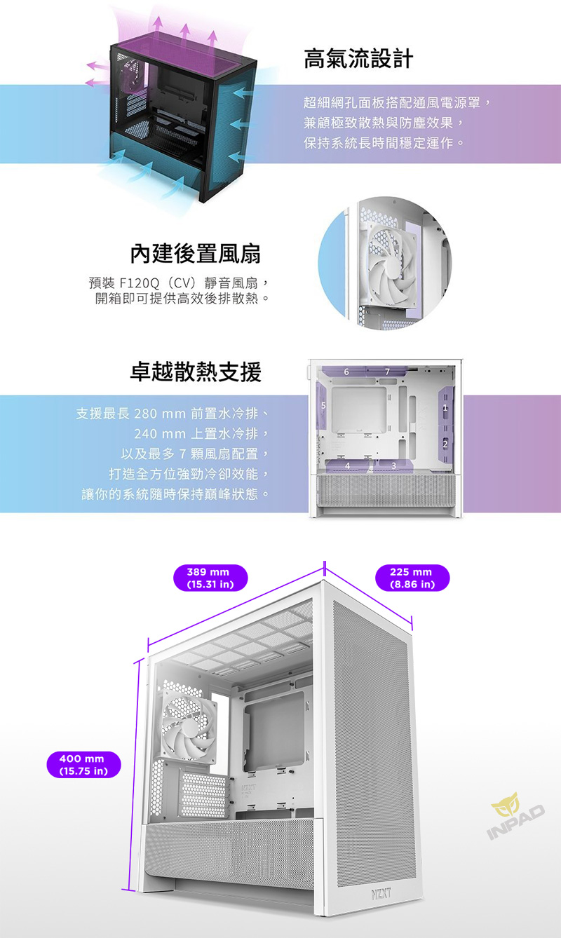 | 支援風扇: | 正面:2 x 120mm / 2 x 140mm 上方:2 x 120mm / 2 x 140mm 後方:1 x 120mm (內含 1 x F120Q (CV)) 底部:1 x 120mm |
