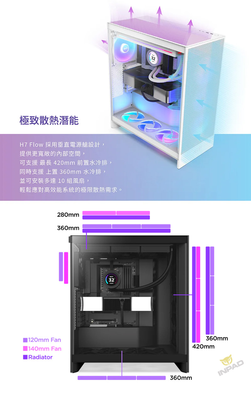 8、前部支援最大 420mm 的散熱器,頂部支援最大 360mm 的散熱器,具有強大的散熱潛力