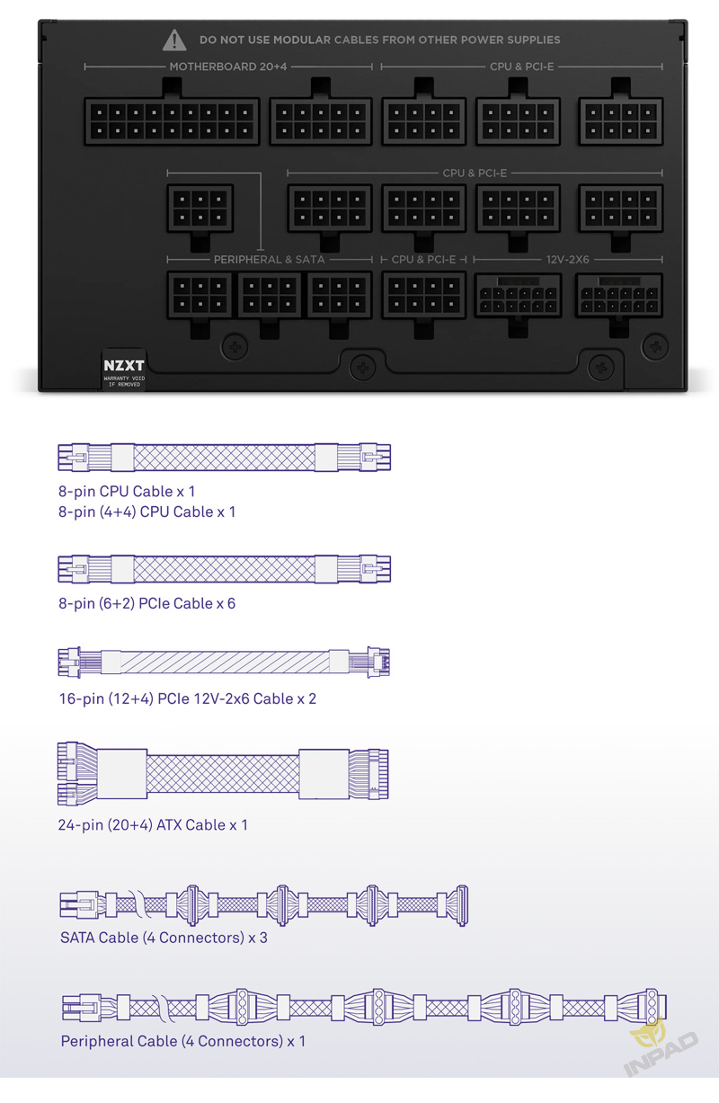 | 線材接頭: | 24-pin ATX Power Cable:1 (600mm) 4+4-pin CPU Power Cable:1 (700mm) 8-pin CPU Power Cable:1 (700mm) 6+2-pin PCIe Power Cable:6 (650mm) 16-pin (12+4) 12V-2x6 PCIe Cable:2 (650mm) SATA Cable:12 (500 + 150mm) Peripherals Cable:4 (500 + 150mm) |