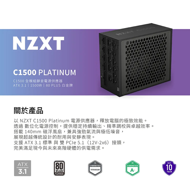 | 品名: | NZXT C1500 ATX3.1 1500W 電源供應器白金牌 |