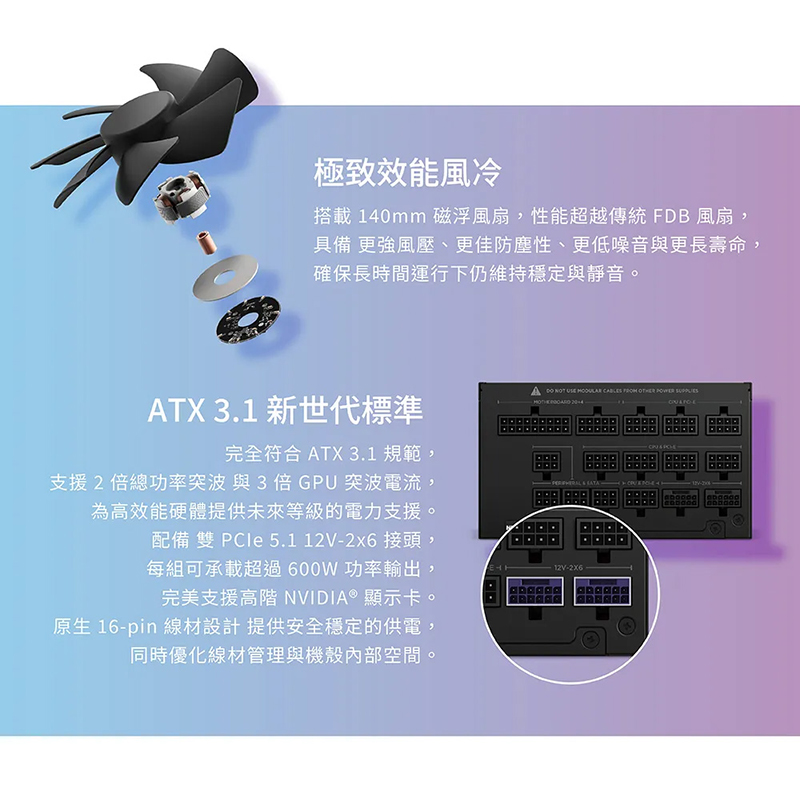 6、採用 ATX 3.1 和 PCIe 5.1 標準設計,可為當前和未來幾代高效能 GPU 和 CPU 提供動力